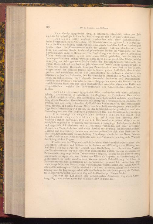 Debreczin( 1867 eröffnet, verbunden mit einer einer Ackerbaufchule, fechs Profefforen, zwei Affiftenten. 1871 Staatsfubvention 43.000 fl. 2 Jahrgänge) hatte die Weltaus ftellung befchickt mit einer durch Profeffor Lackner verfertigten Studie über die Zuwachsverhältniffe der Akazie( Robinia pfeudoacacia) auf Flug- und anderem Sande, fowie auf gebundenem Boden im Vergleiche mit dem Zuwachsgange anderer Holzarten. Die Darftellung war durch grofse graphifche Bilder( wirkliche Stärke, ½, der natürlichen Höhe) gefchehen, welche mit den Stammquerfchnitten belegt wurden; dann durch kleine graphifche Bilder, welche in verjüngtem, fehr genauem Mafse theils die Stärken- Zuwachsverhältniffe betrafen, theils fich auf den laufend jährlichen und Durchfchnitts- Jahreszuwachs in Cubik- Fufs folider Holzmaffe bezogen. Zuwachstafeln von fünf zu fünf Jahren, ausgearbeitet für einzelne Bäume und Beftände, gaben Auffchlufs über Zahlengröfsen und enthielten, aufser der Charakteriſtik des Beftandes, das Alter des Stammes, refpective Beftandes, den Durchmeffer in Brufthöhe in 1/20 der Scheitelhöhe, die Scheitelhöhe, die Holzmaffe, Formzahl, laufenden und Durchfchnittszuwachs und Prefsler's Zuwachs- Percente. Beigegeben waren die Bodenarten der verfchiedenen Standorte mit ihren phyfikalifchen Analyfen, dann eine Reihe von Gegenftänden, welche die Verwendbarkeit des Akazienholzes demonftriren