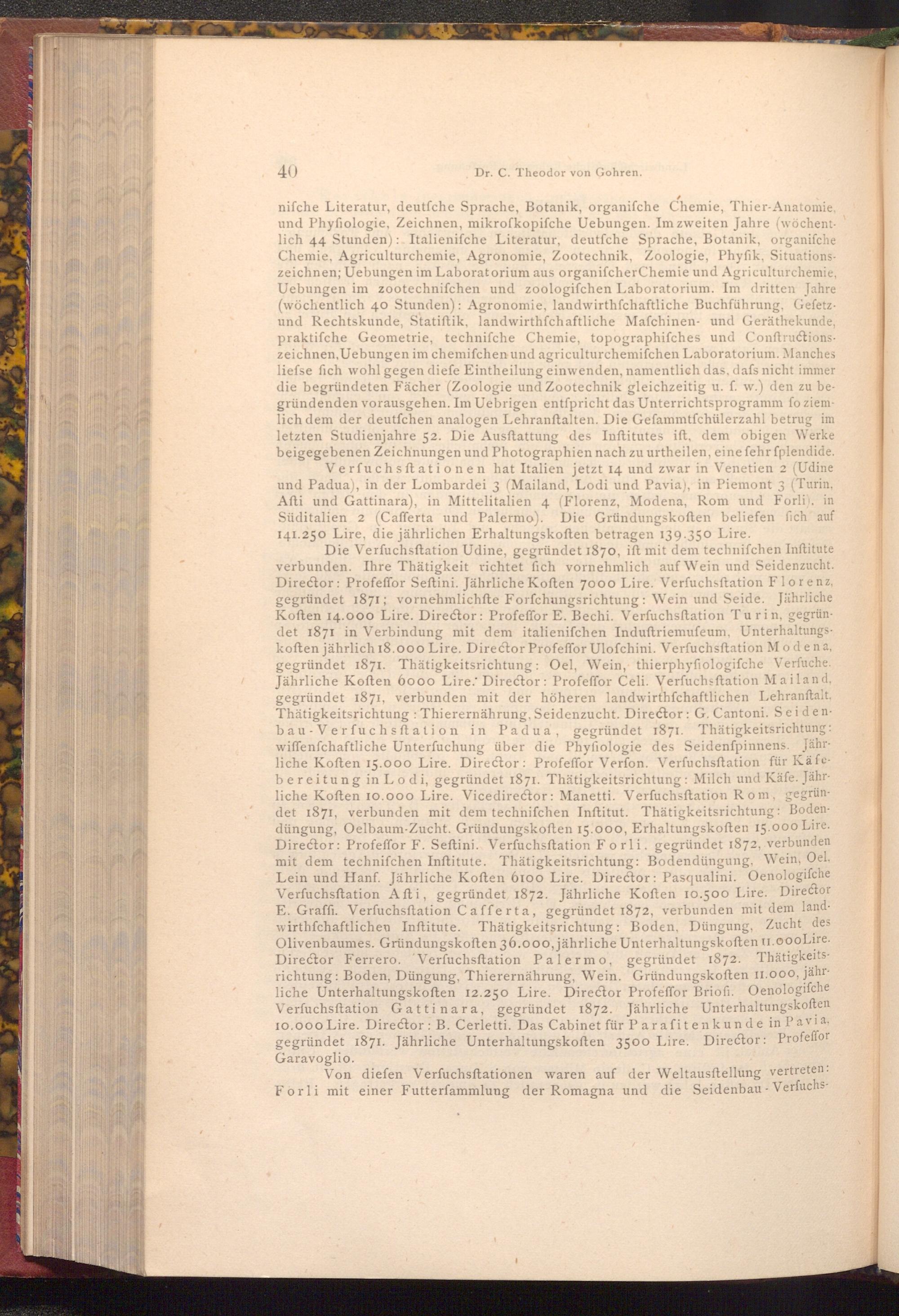 Die Verfuchsftation Udine, gegründet 1870, ift mit dem technischen Inſtitute verbunden. Ihre Thätigkeit richtet fich vornehmlich auf Wein und Seidenzucht. Director: Profeffor Seftini. Jährliche Koften 7000 Lire. Verfuchsftation Florenz, gegründet 1871; vornehmlichfte Forfchungsrichtung: Wein und Seide. Jährliche Koften 14.000 Lire. Director: Profeffor E. Bechi. Verfuchsftation Turin, gegründet 1871 in Verbindung mit dem italienifchen Induftriemufeum, Unterhaltungskoften jährlich 18.000 Lire. Director Profeffor Ulofchini. Verfuchsftation Modena, gegründet 1871. Thätigkeitsrichtung: Oel, Wein, thierphyfiologifche Verfuche. Jährliche Koften 6000 Lire. Director: Profeffor Celi. Verfuchsftation Mailand, gegründet 1871, verbunden mit der höheren landwirthschaftlichen Lehranstalt, Thätigkeitsrichtung Thierernährung, Seidenzucht. Director: G. Cantoni. Seidenbau- Verfuchsftation in Padua, gegründet 1871. Thätigkeitsrichtung: wiffenfchaftliche Unterfuchung über die Phyfiologie des Seidenfpinnens. Jähr liche Koften 15.000 Lire. Director: Profeffor Verfon. Verfuchsftation für Käfebereitung in Lodi, gegründet 1871. Thätigkeitsrichtung: Milch und Käfe. Jährliche Koften 10.000 Lire. Vicedirector: Manetti. Verfuchsftation Rom, gegründet 1871, verbunden mit dem technifchen Inftitut. Thätigkeitsrichtung: Bodendüngung, Oelbaum- Zucht. Gründungskoften 15.000, Erhaltungskoften 15.000 Lire. Director: Profeffor F. Seftini. Verfuchsftation Forli. gegründet 1872, verbunden mit dem technifchen Inſtitute. Thätigkeitsrichtung: Bodendüngung, Wein, Oel. Lein und Hanf. Jährliche Koften 6100 Lire. Director: Pasqualini. Oenologiſche Verfuchsftation Afti, gegründet, 1872. Jährliche Koften 10.500 Lire. Director E. Graffi. Verfuchsftation Cafferta, gegründet 1872, verbunden mit dem landwirthschaftlichen Inftitute. Thätigkeitsrichtung: Boden, Düngung, Zucht des Olivenbaumes. Gründungskoften 36.000, jährliche Unterhaltungskoften 11.000 Lire. Director Ferrero. Verfuchsftation Palermo, gegründet 1872. Thätigkeitsrichtung: Boden, Düngung, Thierernährung, Wein. Gründungskoften 11.000, jähr liche Unterhaltungskoften 12.250 Lire. Director Profeffor Briofi. Oenologiſche Verfuchsftation Gattinara, gegründet 1872. Jährliche Unterhaltungskoften 10.000 Lire. Director: B. Cerletti. Das Cabinet für Parafitenkunde in Pavia, gegründet 1871. Jährliche Unterhaltungskoften 3500 Lire. Director: Profeffor Garavoglio.