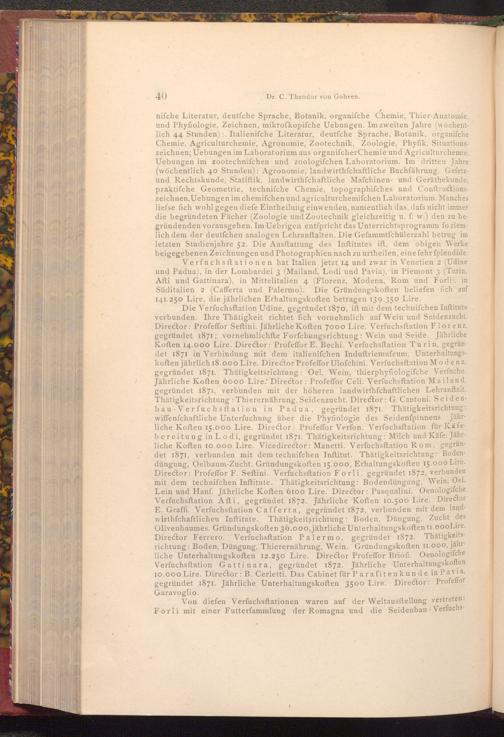 nifche Literatur, deutfche Sprache, Botanik, organifche Chemie, Thier- Anatomie, und Phyfiologie, Zeichnen, mikrofkopifche Uebungen. Im zweiten Jahre( wöchentlich 44 Stunden): Italienifche Literatur, deutfche Sprache, Botanik, organifche Chemie, Agriculturchemie, Agronomie, Zootechnik, Zoologie, Phyfik, Situationszeichnen; Uebungen im Laboratorium aus organifcher Chemie und Agriculturchemie, Uebungen im zootechnifchen und zoologifchen Laboratorium. Im dritten Jahre ( wöchentlich 40 Stunden): Agronomie, landwirthschaftliche Buchführung, Gefetzund Rechtskunde, Statiſtik, landwirthfchaftliche Mafchinen- und Geräthekunde, praktifche Geometrie, techniſche Chemie, topographifches und Conftructions. zeichnen, Uebungen im chemifchen und agriculturchemifchen Laboratorium. Manches liefse fich wohl gegen diefe Eintheilung einwenden, namentlich das, dafs nicht immer die begründeten Fächer( Zoologie und Zootechnik gleichzeitig u. f. w.) den zu begründenden vorausgehen. Im Uebrigen entſpricht das Unterrichtsprogramm fo ziemlich dem der deutfchen analogen Lehranstalten. Die Gefammtfchülerzahl betrug im letzten Studienjahre 52. Die Ausftattung des Inftitutes ift, dem obigen Werke beigegebenen Zeichnungen und Photographien nach zu urtheilen, eine fehr fplendide. Verfuchsftationen hat Italien jetzt 14 und zwar in Venetien 2( Udine und Padua), in der Lombardei 3( Mailand, Lodi und Pavia), in Piemont 3( Turin, Afti und Gattinara), in Mittelitalien 4( Florenz, Modena, Rom und Forli), in Süditalien 2( Cafferta und Palermo). Die Gründungskoften beliefen fich auf 141.250 Lire, die jährlichen Erhaltungskoften betragen 139.350 Lire.