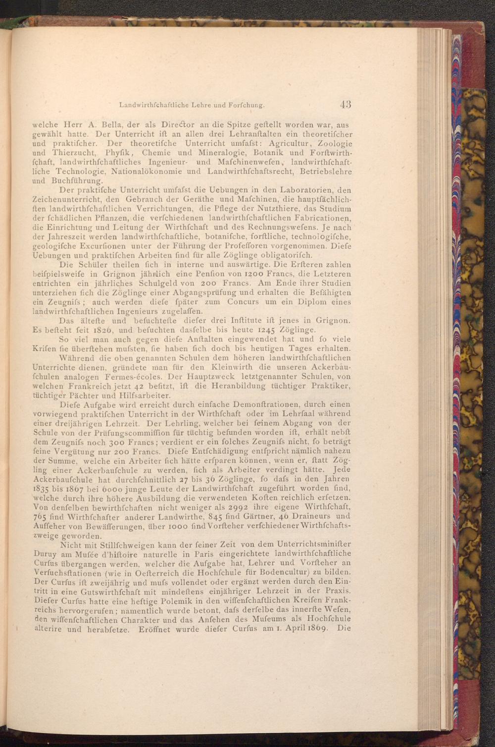 Nicht mit Stillfchweigen kann der feiner Zeit von dem Unterrichtsminifter Duruy am Mufée d'hiftoire naturelle in Paris eingerichtete landwirthschaftliche Curfus übergangen werden, welcher die Aufgabe hat, Lehrer und Vorfteher an Verfuchsftationen( wie in Oefterreich die Hochfchule für Bodencultur) zu bilden. Der Curfus ift zweijährig und mufs vollendet oder ergänzt werden durch den Eintritt in eine Gutswirthschaft mit mindeſtens einjähriger Lehrzeit in der Praxis. Diefer Curfus hatte eine heftige Polemik in den wiffenfchaftlichen Kreifen Frankreichs hervorgerufen; namentlich wurde betont, dafs derfelbe das innerfte Wefen, den wiffenfchaftlichen Charakter und das Anfehen des Muſeums als Hochfchule alterire und herabfetze. Eröffnet wurde diefer Curfus am 1. April 1869. Die
