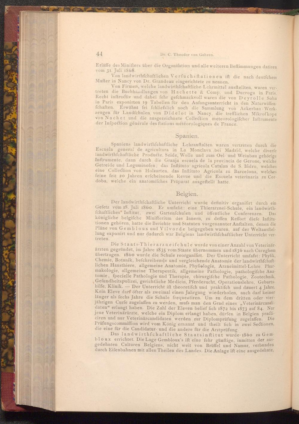 Spaniens landwirthschaftliche Lehranftalten waren vertreten durch die Escuela general de agricultura in La Monclava bei Madrid, welche diverfe landwirthfchaftliche Producte, Seide, Wolle und zum Oel- und Weinbau gehörige Inftrumente, dann durch die Granja escuela de la provincia de Gerone, welche Getreide und Leguminofen; das Inftituto agricola Catalan de S. Ifidro, welches eine Collection von Holzarten, das Inftituto Agricola zu Barcelona, welches feine feit 20 Jahren erfcheinende Revue und die Escuela veterinaria zu Cordoba, welche ein anatomifches Präparat ausgeftellt hatte.