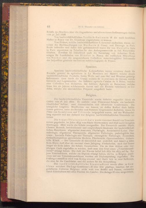Der landwirthschaftliche Unterricht wurde definitiv organifirt durch ein Gefetz vom 18. Juli 1860. Er umfafst: eine Thierarznei- Schule, ein landwirthfchaftliches Inftitut, zwei Gartenfchulen und öffentliche Conferenzen. Das königliche belgifche Minifterium des Innern, zu deffen Reffort diefe Inftitutionen gehören, hatte die Berichte und Statuten vorgenannter Anftalten, denen die Pläne von Gembloux und Vilvorde beigegeben waren, auf der Weltausftellung exponirt und nur dadurch war Belgiens landwirthschaftlicher Unterricht ver