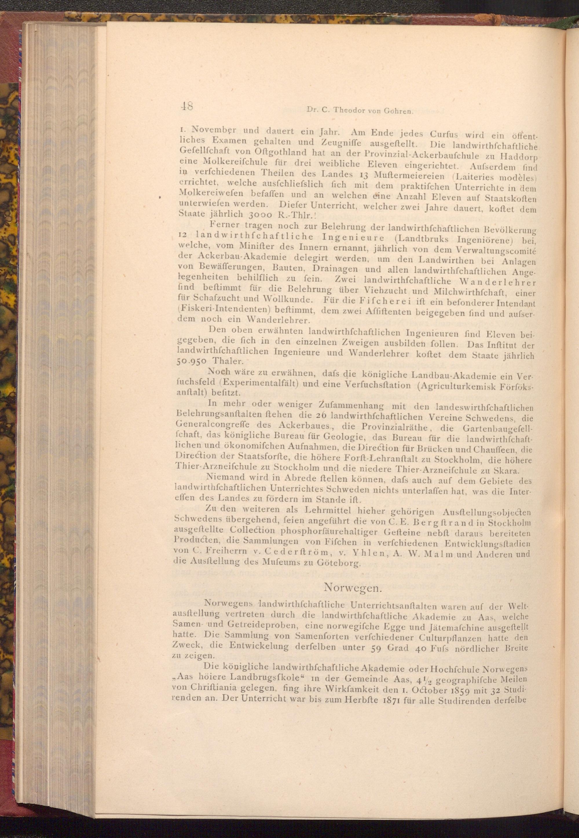 Norwegens landwirthschaftliche Unterrichtsanftalten waren auf der Weltausftellung vertreten durch die landwirthfchaftliche Akademie zu Aas, welche Samen- und Getreideproben, eine norwegifche Egge und Jätemafchine ausgeftellt hatte. Die Sammlung von Samenforten verfchiedener Culturpflanzen hatte den Zweck, die Entwickelung derfelben unter 59 Grad 40 Fufs nördlicher Breite zu zeigen.