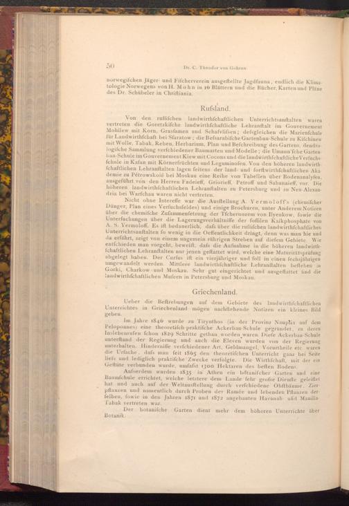 Von den ruffifchen landwirthfchaftlichen Unterrichtsanftalten vertreten die Goretzkifche landwirthfchaftliche Lehranftalt im Gouvernement Mohilew mit Korn, Grasfamen und Schafvlifsen; defsgleichen die Marienfchule für Landwirthschaft bei Sfaratow; die Befsarabifche Gartenbau- Schule zu Kifchinew mit Wolle, Tabak, Reben, Herbarium, Plan und Befchreibung des Gartens, dendrologifche Sammlung verfchiedener Baumarten und Modelle; die Umann'fche Gartenbau- Schule im Gouvernement Kiew mit Cocons und die landwirthfchaftliche Verfuchsfchule in Kafan mit Körnerfrüchten und Leguminofen. Von den höheren landwirthfchaftlichen Lehranftalten lagen feitens der land- und forftwirthfchaftlichen Akademie zu Pétrowskoié bei Moskau eine Reihe von Tabellen über Bodenanalyfen, ausgeführt von den Herren Fadeieff, Griorieff, Petroff und Sabanaieff, vor. Die höheren landwirthschaftlichen Lehranstalten zu Petersburg und zu Neu- Alexandria bei Warfchau waren nicht vertreten.