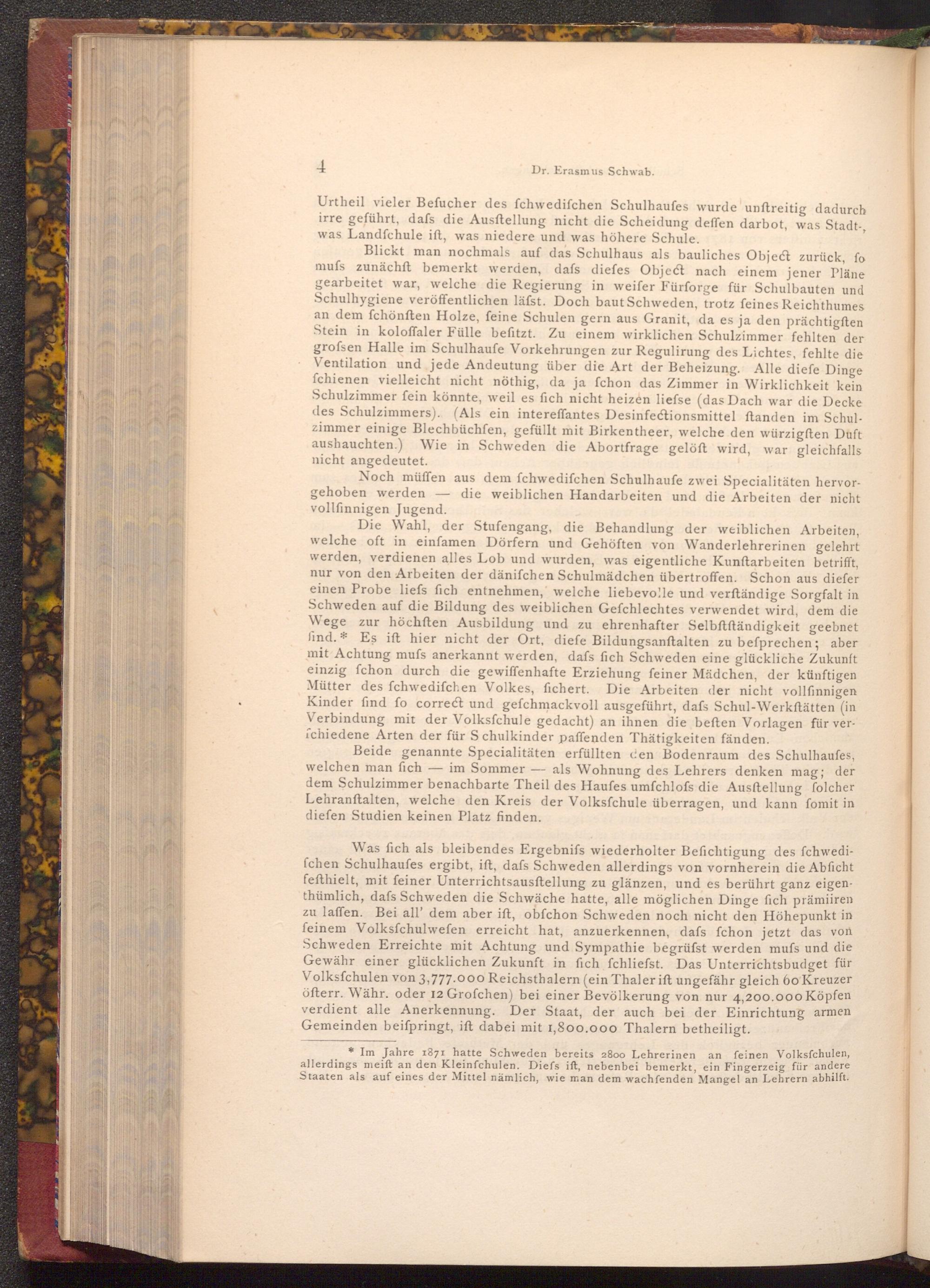 * Im Jahre 1871 hatte Schweden bereits 2800 Lehrerinen an feinen Volksfchulen, allerdings meift an den Kleinfchulen. Diefs ift, nebenbei bemerkt, ein Fingerzeig für andere Staaten als auf eines der Mittel nämlich, wie man dem wachfenden Mangel an Lehrern abhilft.