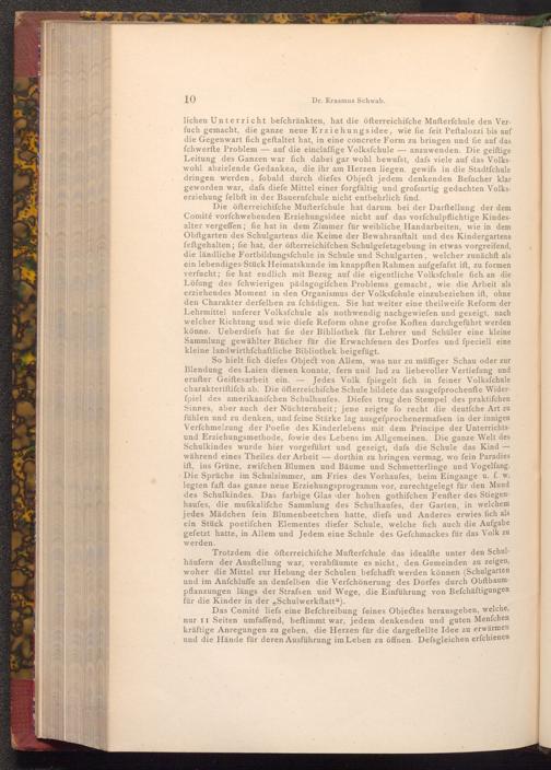 lichen Unterricht befchränkten, hat die öfterreichifche Mufterfchule den Verfuch gemacht, die ganze neue Erziehungsidee, wie fie feit Peftalozzi bis auf die Gegenwart fich geftaltet hat, in eine concrete Form zu bringen und fie auf das fchwerfte Problem auf die einclaffige Volksfchule anzuwenden. Die geiftige Leitung des Ganzen war fich dabei gar wohl bewufst, dafs viele auf das Volkswohl abzielende Gedanken, die ihr am Herzen liegen, gewifs in die Stadtfchule dringen werden, fobald durch diefes Object jedem denkenden Befucher klar geworden war, dafs diefe Mittel einer forgfältig und grofsartig gedachten Volkserziehung felbft in der Bauernfchule nicht entbehrlich find.