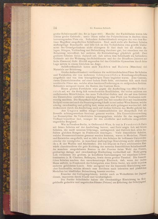 Wie in Preufsen Berlin, in Oefterreich Wien, fo trat in Frankreich Paris mit feinen Schulen auf der Ausftellung hervor, und Paris' zeigte fich mit feinen Schulen, die meift neueren Urfprungs, umfangreich und ftattlich find, allen Anftalten gleichen Ranges in Frankreich überlegen. Viele franzöfifche Schulen, welche Monumentalbauten genannt werden könnten, waren in Modellen, Plänen und Entwürfen ausgeftellt, und es läfst fich den Schulen für beftimmte Unterrichtszwecke die vorzügliche, ja manchmal muftergiltige Einrichtung nicht abfprechen ( fo z. B. der Waifen- und Afylhäufer). Die bei Dupont in Paris erfchienenen Entwürfe charakterifiren die gute Richtung der neueren franzöfifchen Schulbaukunft. An manchen ausgedehnten Bauten in der Provinz fielen Wahl des Platzes, grofsartige Anlage und zweckmäfsige Eintheilung vortheilhaft auf. Nicht genug Lob verdienen die grofsen, ja koloffalen Gartenanlagen bei einzelnen Lehrerfeminarien( z. B. Chartres, Befançon), fowie deren grofser Turnhof. Die franzöfifchen Schulen machen den unverkennbaren Eindruck, dafs, wenn der rechte Mann auftritt, in Frankreich der Schulgarten eine Stätte findet, wie nicht in jedem anderen gebildeten Lande. Sehr anregend war die finnreiche Einrichtung mancher Zeichenfäle, welche Abends zum Zeichnen nach lebenden und plaftifchen Modellen bei künftlicher Beleuchtung benutzt werden.