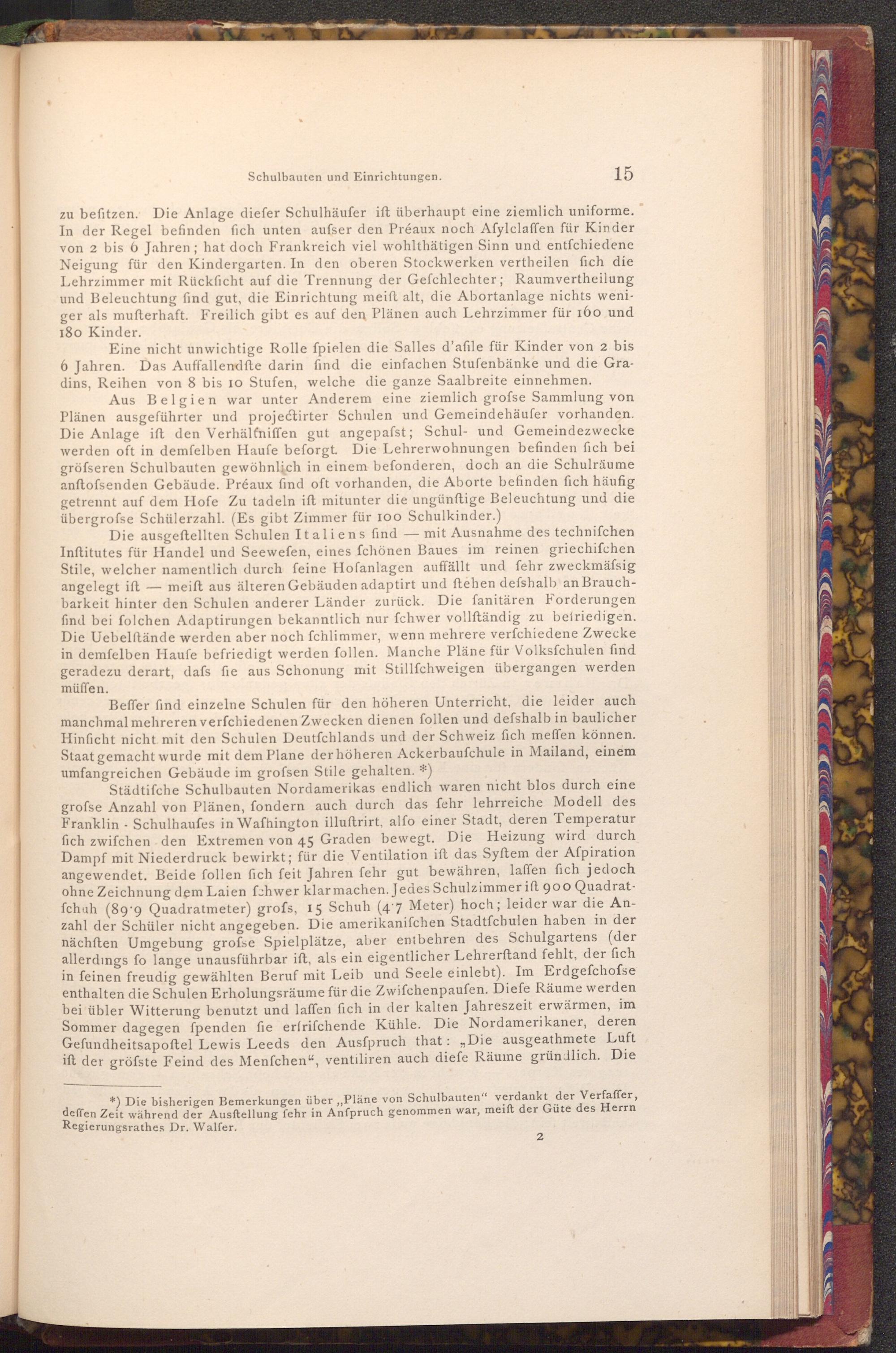 Städtifche Schulbauten Nordamerikas endlich waren nicht blos durch eine grofse Anzahl von Plänen, fondern auch durch das fehr lehrreiche Modell des Franklin Schulhaufes in Waſhington illuftrirt, alfo einer Stadt, deren Temperatur fich zwifchen den Extremen von 45 Graden bewegt. Die Heizung wird durch Dampf mit Niederdruck bewirkt; für die Ventilation ift das Syftem der Afpiration angewendet. Beide follen fich feit Jahren fehr gut bewähren, laffen fich jedoch ohne Zeichnung dem Laien fchwer klar machen. Jedes Schulzimmer ift 900 Quadratfchuh( 89.9 Quadratmeter) grofs, 15 Schuh( 47 Meter) hoch; leider war die Anzahl der Schüler nicht angegeben. Die amerikanifchen Stadtfchulen haben in der nächsten Umgebung grofse Spielplätze, aber entbehren des Schulgartens( der allerdings fo lange unausführbar ift, als ein eigentlicher Lehrerftand fehlt, der fich in feinen freudig gewählten Beruf mit Leib und Seele einlebt). Im Erdgefchofse enthalten die Schulen Erholungsräume für die Zwifchenpaufen. Diefe Räume werden bei übler Witterung benutzt und laffen fich in der kalten Jahreszeit erwärmen, im Sommer dagegen fpenden fie erfrifchende Kühle. Die Nordamerikaner, deren Gefundheitsapoftel Lewis Leeds den Ausfpruch that:„ Die ausgeathmete Luft ift der gröfste Feind des Menfchen", ventiliren auch diefe Räume gründlich. Die