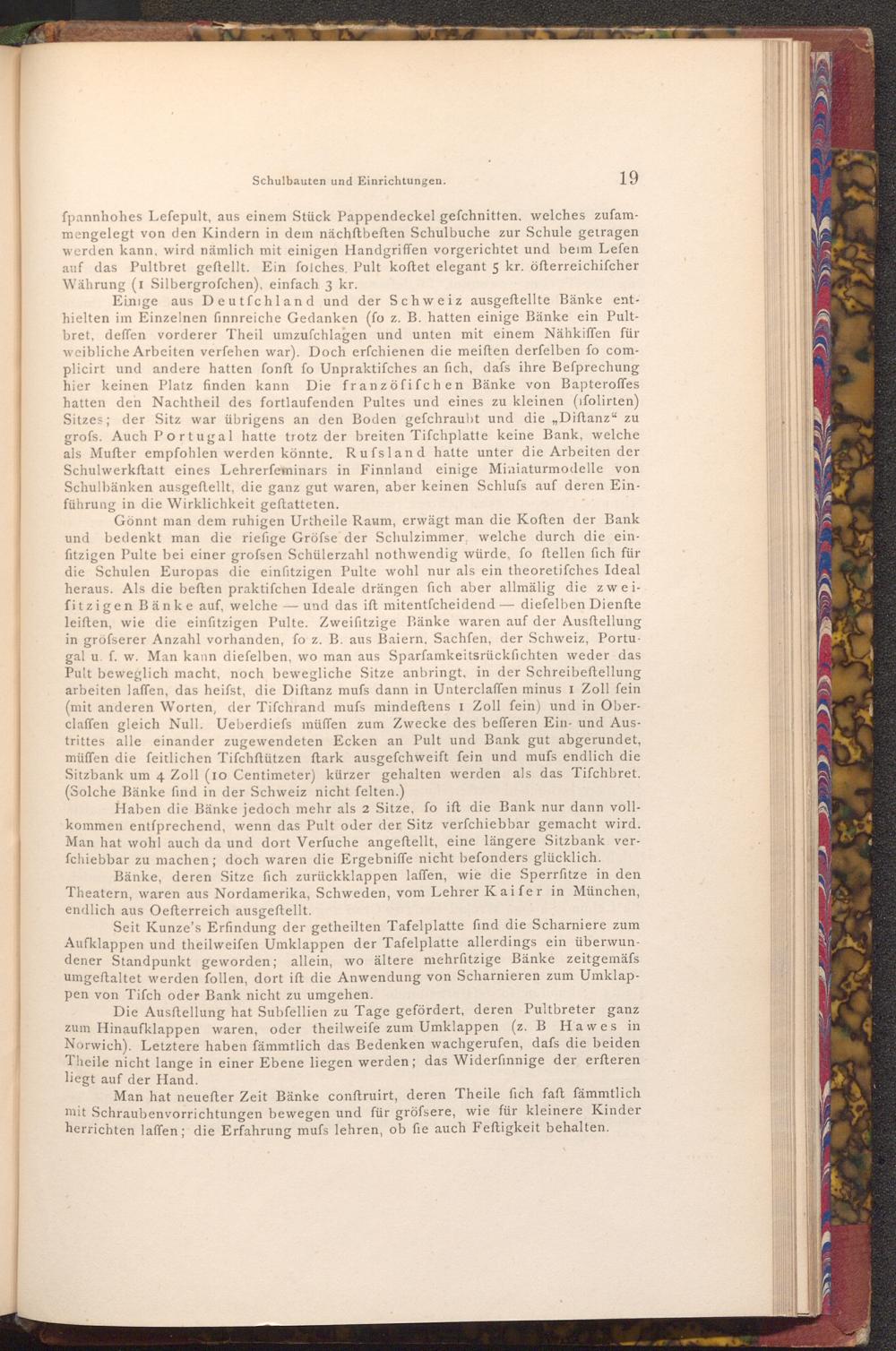 Gönnt man dem ruhigen Urtheile Raum, erwägt man die Koften der Bank und bedenkt man die riefige Gröfse der Schulzimmer, welche durch die einfitzigen Pulte bei einer grofsen Schülerzahl nothwendig würde, fo ftellen fich für die Schulen Europas die einfitzigen Pulte wohl nur als ein theoretifches Ideal heraus. Als die beften praktiſchen Ideale drängen fich aber allmälig die zweifitzigen Bänke auf, welche und das ift mitentfcheidend diefelben Dienfte leiften, wie die einfitzigen Pulte. Zweifitzige Bänke waren auf der Ausftellung in gröfserer Anzahl vorhanden, fo z. B. aus Baiern, Sachfen, der Schweiz, Portugal u. f. w. Man kann diefelben, wo man aus Sparfamkeitsrückfichten weder das Pult beweglich macht, noch bewegliche Sitze anbringt, in der Schreibeftellung arbeiten laffen, das heifst, die Diftanz mufs dann in Unterclaffen minus I Zoll fein ( mit anderen Worten, der Tifchrand mufs mindeſtens 1 Zoll fein) und in Oberclaffen gleich Null. Ueberdiefs müffen zum Zwecke des befferen Ein- und Austrittes alle einander zugewendeten Ecken an Pult und Bank gut abgerundet, müffen die feitlichen Tifchftützen ftark ausgefchweift fein und mufs endlich die Sitzbank um 4 Zoll( 10 Centimeter) kürzer gehalten werden als das Tifchbret. ( Solche Bänke find in der Schweiz nicht felten.)