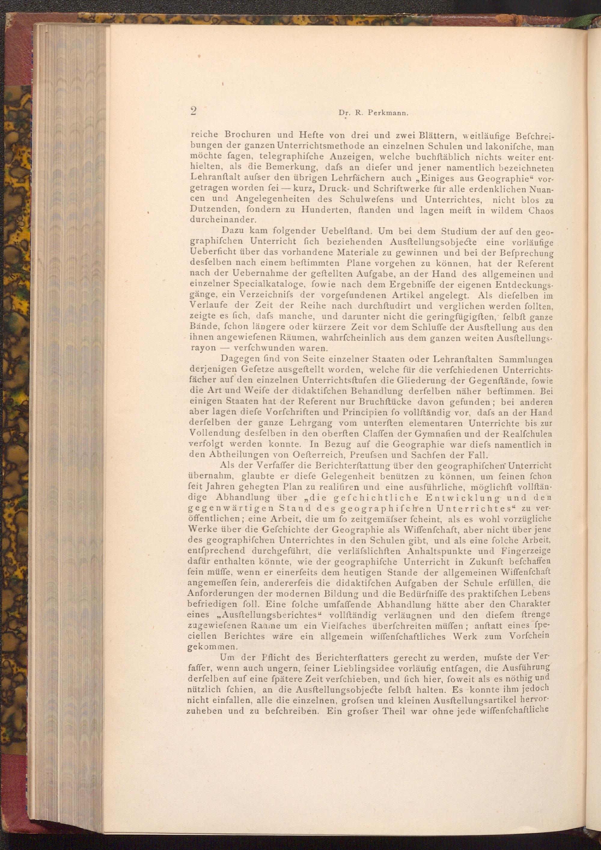 Dazu kam folgender Uebelftand. Um bei dem Studium der auf den geographifchen Unterricht fich beziehenden Ausftellungsobjecte eine vorläufige Ueberficht über das vorhandene Materiale zu gewinnen und bei der Befprechung desfelben nach einem beftimmten Plane vorgehen zu können, hat der Referent nach der Uebernahme der geftellten Aufgabe, an der Hand des allgemeinen und einzelner Specialkataloge, fowie nach dem Ergebniffe der eigenen Entdeckungsgänge, ein Verzeichniss der vorgefundenen Artikel angelegt. Als diefelben im Verlaufe der Zeit der Reihe nach durchftudirt und verglichen werden follten, zeigte es fich, dafs manche, und darunter nicht die geringfügigften, felbft ganze Bände, fchon längere oder kürzere Zeit vor dem Schluffe der Ausftellung aus den ihnen angewiefenen Räumen, wahrfcheinlich aus dem ganzen weiten Ausstellungsrayon- verfchwunden waren.