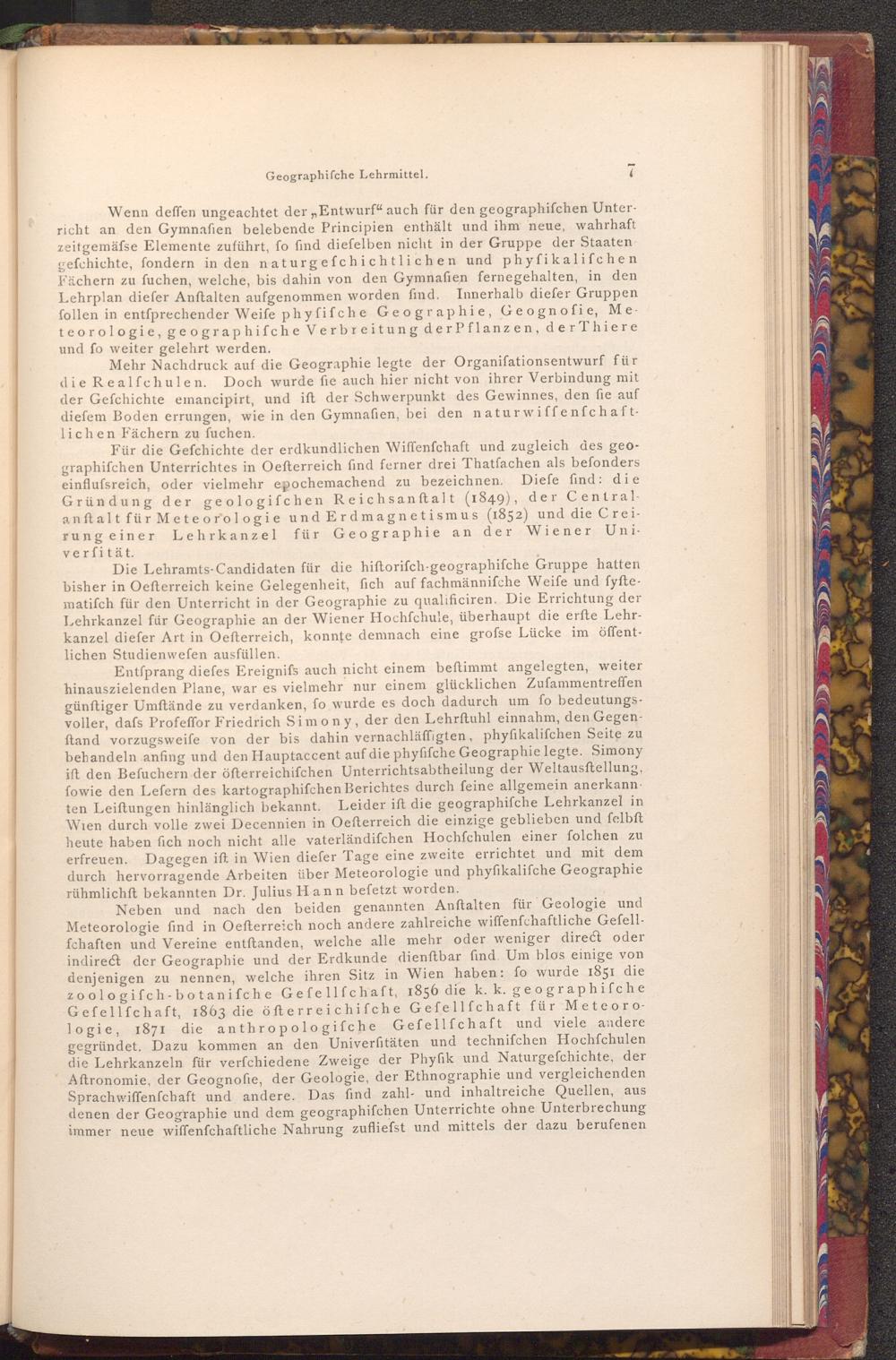 Neben und nach den beiden genannten Anftalten für Geologie und Meteorologie find in Oefterreich noch andere zahlreiche wiffenfchaftliche Gefellfchaften und Vereine entstanden, welche alle mehr oder weniger direct oder indirect der Geographie und der Erdkunde dienftbar find. Um blos einige von denjenigen zu nennen, welche ihren Sitz in Wien haben: fo wurde 1851 die zoologifch- botanifche Gefellfchaft, 1856 die k. k. geographifche Gefellfchaft, 1863 die öfterreichifche Gefellfchaft für Meteorologie, 1871 die anthropologifche Gefellfchaft und viele andere gegründet. Dazu kommen an den Univerfitäten und technifchen Hochfchulen die Lehrkanzeln für verfchiedene Zweige der Phyfik und Naturgefchichte, der Aftronomie, der Geognofie, der Geologie, der Ethnographie und vergleichenden Sprachwiffenfchaft und andere. Das find zahl- und inhaltreiche Quellen, aus denen der Geographie und dem geographifchen Unterrichte ohne Unterbrechung immer neue wiffenfchaftliche Nahrung zufliefst und mittels der dazu berufenen