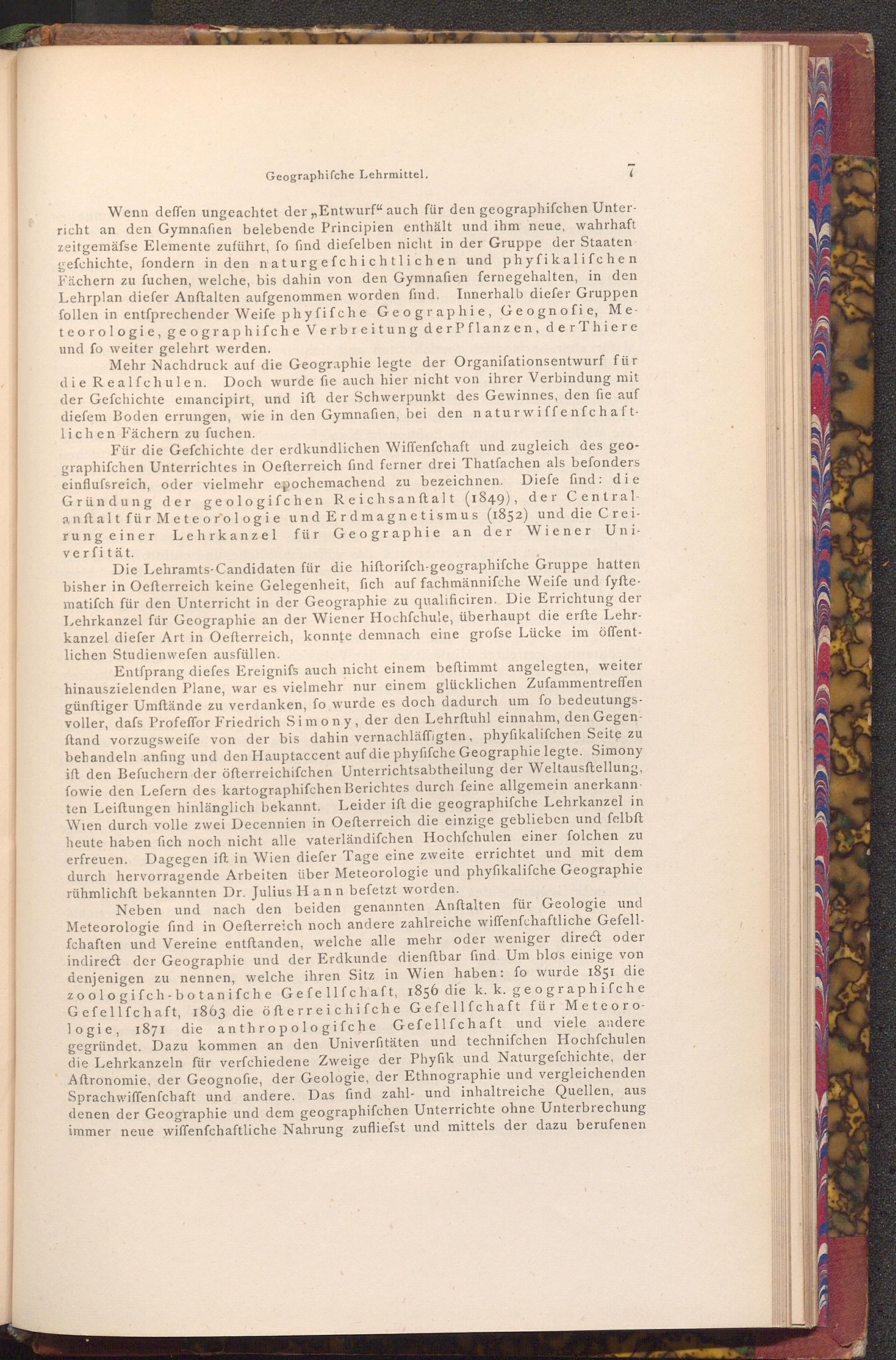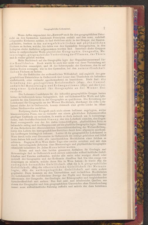 Entfprang diefes Ereignifs auch nicht einem beftimmt angelegten, weiter hinauszielenden Plane, war es vielmehr nur einem glücklichen Zufammentreffen. günftiger Umftände zu verdanken, fo wurde es doch dadurch um fo bedeutungsvoller, dafs Profeffor Friedrich Simony, der den Lehrftuhl einnahm, den Gegenftand vorzugsweife von der bis dahin vernachläffigten, phyfikalifchen Seite zu behandeln anfing und den Hauptaccent auf die phyfifche Geographie legte. Simony ift den Befuchern der öfterreichifchen Unterrichtsabtheilung der Weltausstellung, fowie den Lefern des kartographifchen Berichtes durch feine allgemein anerkannten Leiftungen hinlänglich bekannt. Leider ift die geographifche Lehrkanzel in Wien durch volle zwei Decennien in Oefterreich die einzige geblieben und felbft heute haben fich noch nicht alle vaterländifchen Hochfchulen einer folchen zu erfreuen. Dagegen ift in Wien diefer Tage eine zweite errichtet und mit dem durch hervorragende Arbeiten über Meteorologie und phyfikalifche Geographie rühmlichft bekannten Dr. Julius Hann befetzt worden.