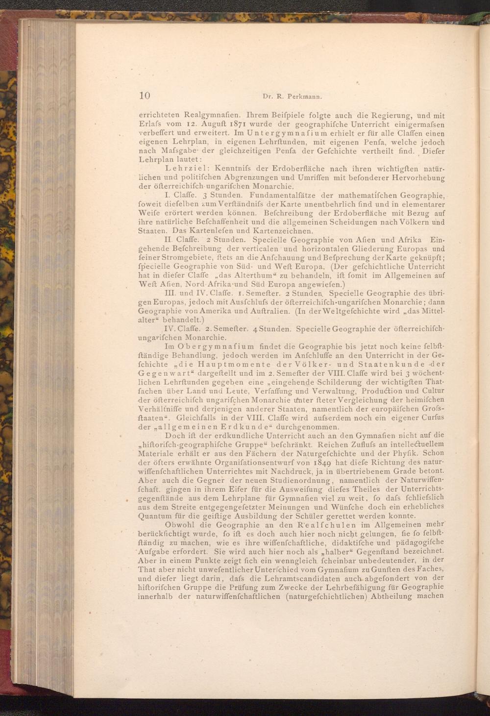 errichteten Realgymnafien. Ihrem Beiſpiele folgte auch die Regierung, und mit Erlafs vom 12. Auguft 1871 wurde der geographifche Unterricht einigermassen verbeffert und erweitert. Im Untergymnafium erhielt er für alle Claffen einen eigenen Lehrplan, in eigenen Lehrftunden, mit eigenen Penfa, welche jedoch nach Mafsgabe der gleichzeitigen Penfa der Gefchichte vertheilt find. Diefer Lehrplan lautet: