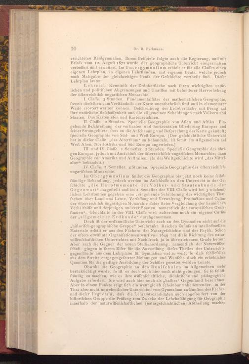 Im Obergymnafium findet die Geographie bis jetzt noch keine felbftftändige Behandlung, jedoch werden im Anfchluffe an den Unterricht in der Gefchichte die Hauptmomente der Völker- und Staatenkunde der Gegenwart dargestellt und im 2. Semefter der VIII. Claffe wird bei 3 wöchentlichen Lehrftunden gegeben eine„ eingehende Schilderung der wichtigften Thatfachen über Land und Leute, Verfaffung und Verwaltung, Production und Cultur der öfterreichiſch ungarifchen Monarchie unter fteter Vergleichung der heimifchen Verhältniffe und derjenigen anderer Staaten, namentlich der europäiſchen Grofsftaaten". Gleichfalls in der VIII. Claffe wird aufserdem noch ein eigener Curfus der allgemeinen Erdkunde" durchgenommen.