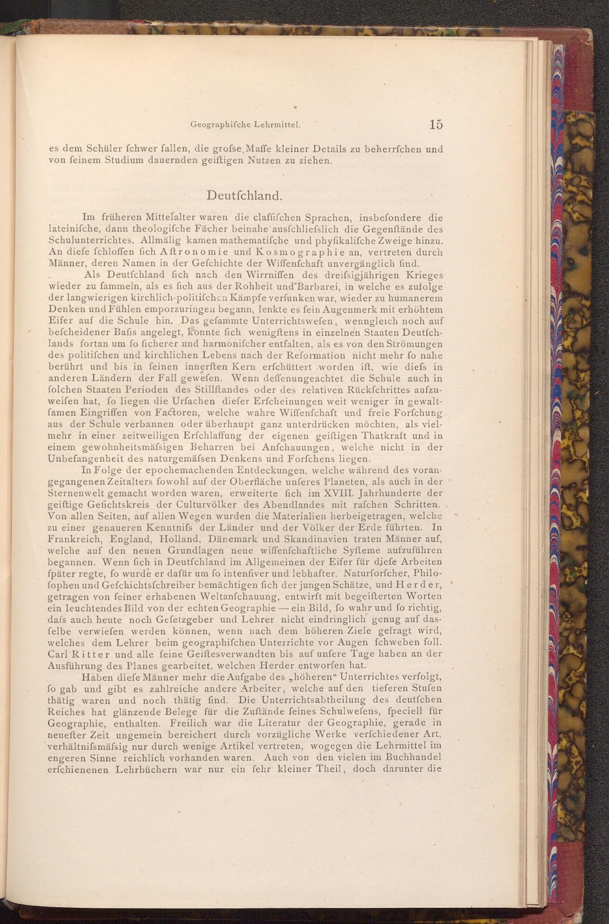 In Folge der epochemachenden Entdeckungen, welche während des vorangegangenen Zeitalters fowohl auf der Oberfläche unferes Planeten, als auch in der Sternenwelt gemacht worden waren, erweiterte fich im XVIII. Jahrhunderte der geiftige Gefichtskreis der Culturvölker des Abendlandes mit rafchen Schritten. Von allen Seiten, auf allen Wegen wurden die Materialien herbeigetragen, welche zu einer genaueren Kenntnifs der Länder und der Völker der Erde führten. In Frankreich, England, Holland, Dänemark und Skandinavien traten Männer auf, welche auf den neuen Grundlagen neue wiffenfchaftliche Syfteme aufzuführen begannen. Wenn fich in Deutſchland im Allgemeinen der Eifer für diefe Arbeiten fpäter regte, fo wurde er dafür um fo intenfiver und lebhafter. Naturforfcher, Philofophen und Gefchichtsfchreiber bemächtigen fich der jungen Schätze, und Herder, getragen von feiner erhabenen Weltanschauung, entwirft mit begeisterten Worten ein leuchtendes Bild von der echten Geographie ein Bild, fo wahr und fo richtig, dafs auch heute noch Gefetzgeber und Lehrer nicht eindringlich genug auf dasfelbe verwiefen werden können, wenn nach dem höheren Ziele gefragt wird, welches dem Lehrer beim geographifchen Unterrichte vor Augen fchweben foll. Carl Ritter und alle feine Geiftesverwandten bis auf unfere Tage haben an der Ausführung des Planes gearbeitet, welchen Herder entworfen hat.