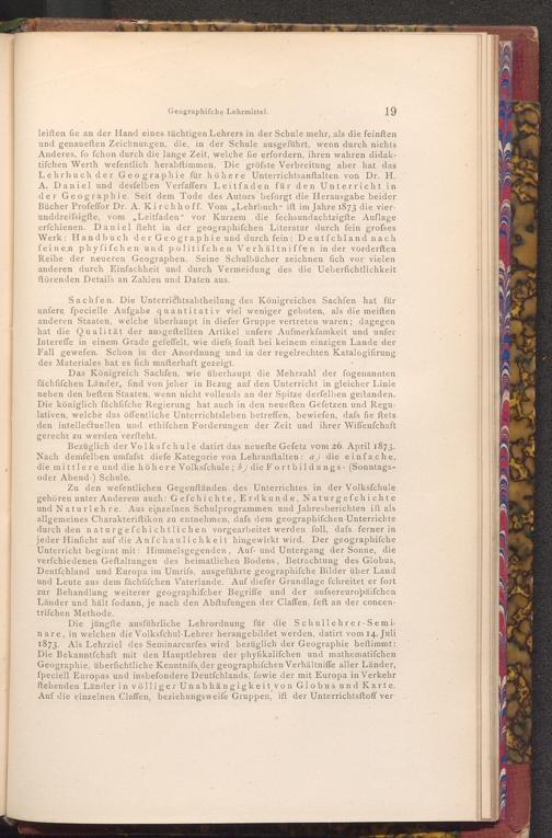 Zu den wefentlichen Gegenftänden des Unterrichtes in der Volksfchule gehören unter Anderem auch: Gefchichte, Erdkunde, Naturgefchichte und Naturlehre. Aus einzelnen Schulprogrammen und Jahresberichten ist als allgemeines Charakteriſtikon zu entnehmen, dafs dem geographifchen Unterrichte durch den naturgefchichtlichen vorgearbeitet werden foll, dafs ferner in jeder Hinsicht auf die Anfchaulichkeit hingewirkt wird. Der geographifche Unterricht beginnt mit: Himmelsgegenden, Auf- und Untergang der Sonne, die verfchiedenen Geftaltungen des heimatlichen Bodens, Betrachtung des Globus, Deutfchland und Europa im Umrifs, ausgeführte geographifche Bilder über Land und Leute aus dem fächfifchen Vaterlande. Auf diefer Grundlage fchreitet er fort zur Behandlung weiterer geographifcher Begriffe und der aufsereuropäiſchen Länder und hält fodann, je nach den Abftufungen der Claffen, feft an der concentrifchen Methode.