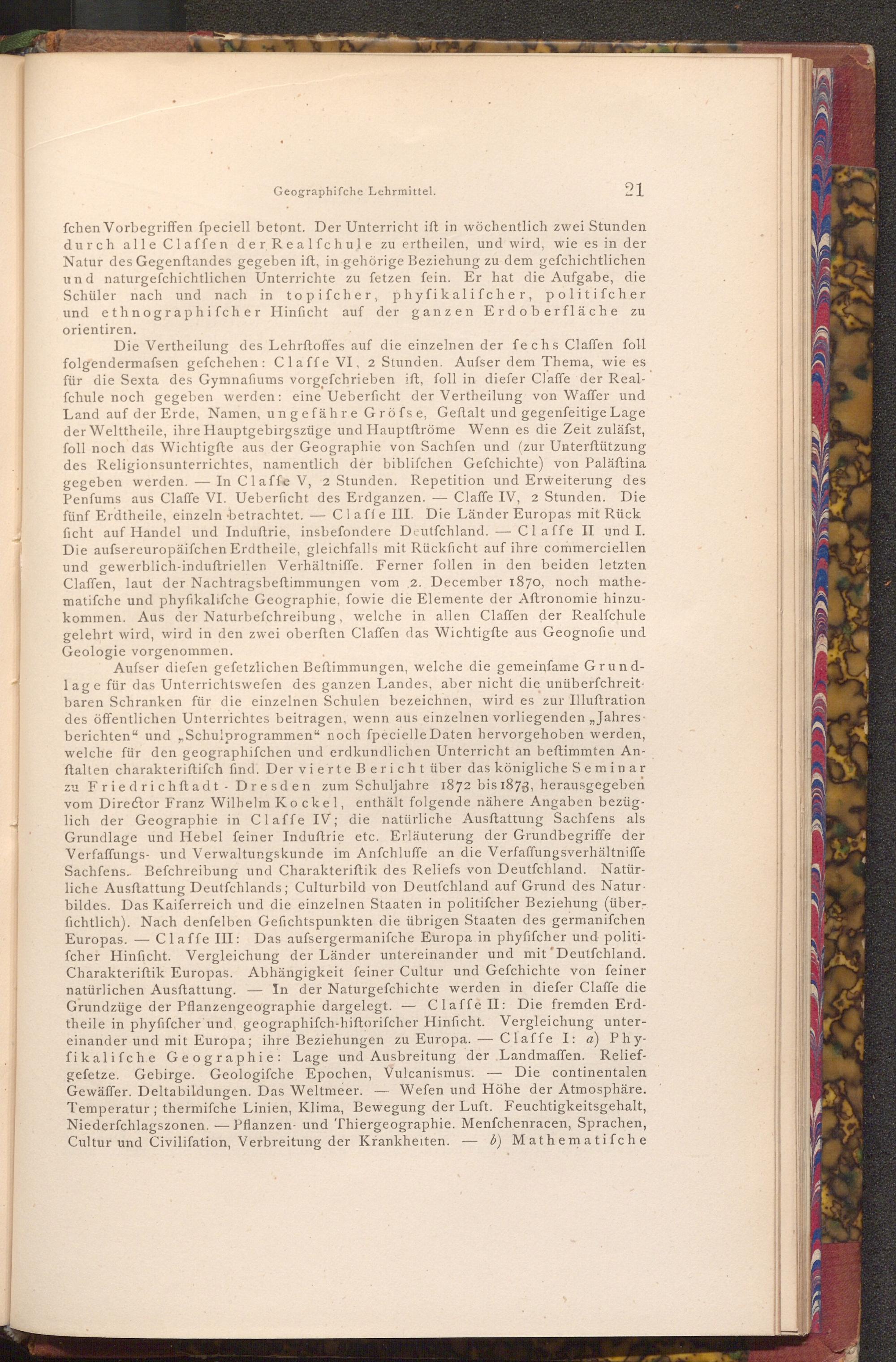 Aufser diefen gefetzlichen Beftimmungen, welche die gemeinfame Grundlage für das Unterrichtswefen des ganzen Landes, aber nicht die unüberfchreitbaren Schranken für die einzelnen Schulen bezeichnen, wird es zur Illuftration des öffentlichen Unterrichtes beitragen, wenn aus einzelnen vorliegenden ,, Jahres berichten" und Schulprogrammen" noch fpecielle Daten hervorgehoben werden, welche für den geographifchen und erdkundlichen Unterricht an beftimmten Anftalten charakteriftifch find. Der vierte Bericht über das königliche Seminar zu Friedrichftadt Dresden zum Schuljahre 1872 bis 1873, herausgegeben vom Director Franz Wilhelm Kockel, enthält folgende nähere Angaben bezüglich der Geographie in Claffe IV; die natürliche Ausftattung Sachfens als Grundlage und Hebel feiner Induftrie etc. Erläuterung der Grundbegriffe der Verfaffungs- und Verwaltungskunde im Anfchluffe an die Verfaffungsverhältniffe Sachfens. Befchreibung und Charakteriſtik des Reliefs von Deutfchland. Natürliche Ausstattung Deutfchlands; Culturbild von Deutſchland auf Grund des Naturbildes. Das Kaiferreich und die einzelnen Staaten in politifcher Beziehung( überfichtlich). Nach denfelben Gefichtspunkten die übrigen Staaten des germanifchen Europas. Claffe III: Das aufsergermanifche Europa in phyfifcher und politifcher Hinficht. Vergleichung der Länder untereinander und mit" Deutſchland. Charakteriſtik Europas. Abhängigkeit feiner Cultur und Gefchichte von feiner natürlichen Ausftattung.-In der Naturgefchichte werden in diefer Claffe die Grundzüge der Pflanzengeographie dargelegt.- Claffe II: Die fremden Erdtheile in phyfifcher und geographifch- hiftorifcher Hinficht. Vergleichung untereinander und mit Europa; ihre Beziehungen zu Europa.- Claffe I: a) Phyfikalifche Geographie: Lage und Ausbreitung der Landmaffen. Reliefgefetze. Gebirge. Geologifche Epochen, Vulcanismus.