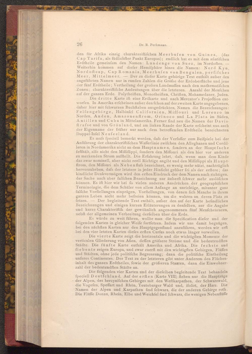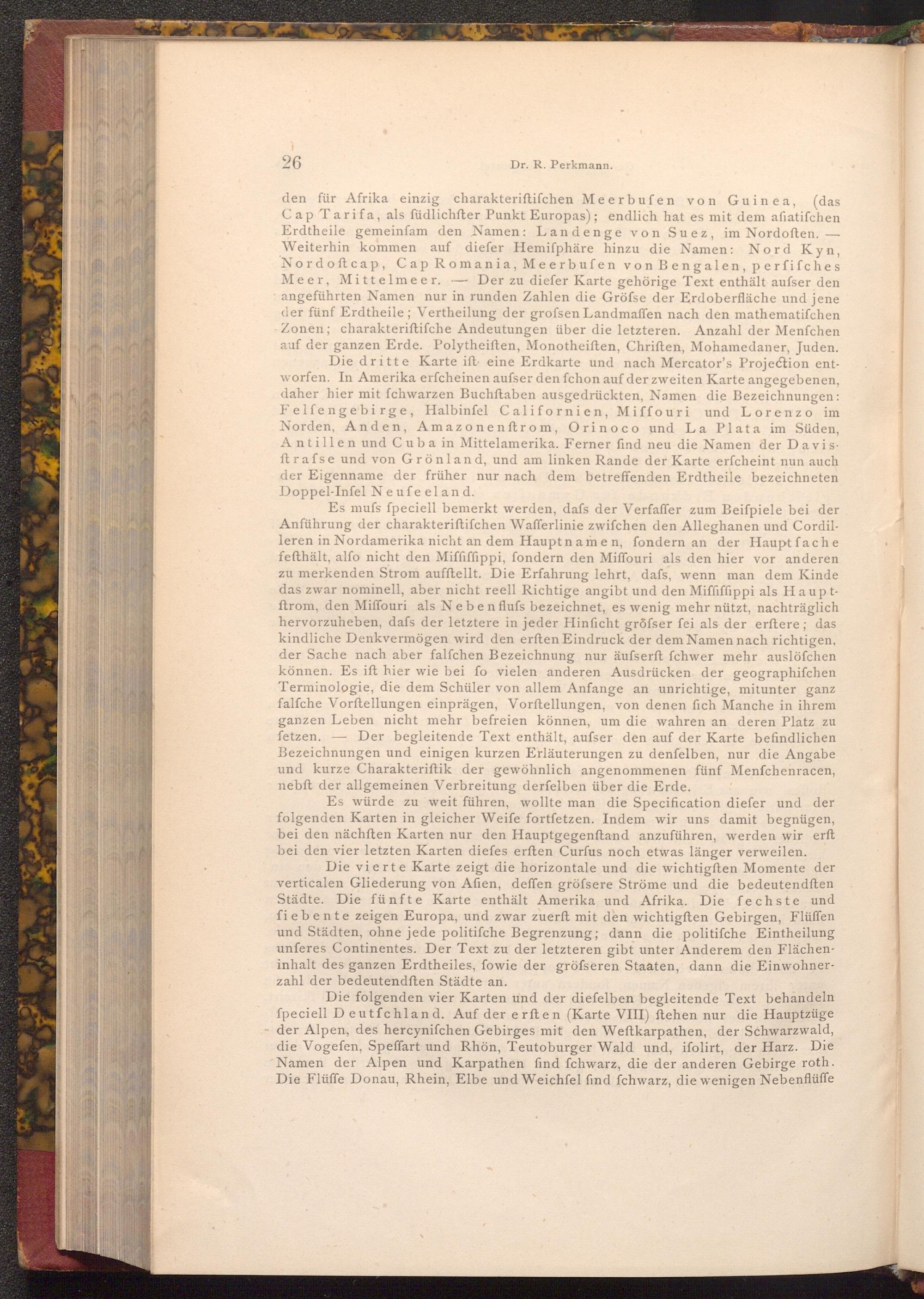 den für Afrika einzig charakteriftifchen Meerbufen von Guinea,( das Cap Tarifa, als füdlichfter Punkt Europas); endlich hat es mit dem aſiatiſchen Erdtheile gemeinfam den Namen: Landenge von Suez, im Nordoften. Weiterhin kommen auf diefer Hemiſphäre hinzu die Namen: Nord Kyn, Nordoftcap, Cap Romania, Meerbufen von Bengalen, perfifches Meer, Mittelmeer. Der zu diefer Karte gehörige Text enthält aufser den angeführten Namen nur in runden Zahlen die Gröfse der Erdoberfläche und jene der fünf Erdtheile; Vertheilung der grofsen Landmaffen nach den mathematiſchen Zonen; charakteriftifche Andeutungen über die letzteren. Anzahl der Menfchen auf der ganzen Erde. Polytheiften, Monotheiften, Chriften, Mohamedaner, Juden. Die dritte Karte ift eine Erdkarte und nach Mercator's Projection entworfen. In Amerika erfcheinen aufser den fchon auf der zweiten Karte angegebenen, daher hier mit fchwarzen Buchftaben ausgedrückten, Namen die Bezeichnungen: Felfengebirge, Halbinfel Californien, Miffouri und Lorenzo im Norden, Anden, Amazonenftrom, Orinoco und La Plata im Süden, Antillen und Cuba in Mittelamerika. Ferner find neu die Namen der Davisftrafse und von Grönland, und am linken Rande der Karte erfcheint nun auch der Eigenname der früher nur nach dem betreffenden Erdtheile bezeichneten Doppel- Infel Neufeeland.
