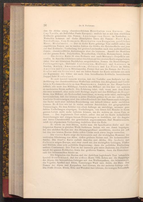 Es mufs fpeciell bemerkt werden, dafs der Verfaffer zum Beiſpiele bei der Anführung der charakteriftifchen Wafferlinie zwifchen den Alleghanen und Cordilleren in Nordamerika nicht an dem Haupt namen, fondern an der Hauptfache fefthält, alfo nicht den Miffiffippi, fondern den Miffouri als den hier vor anderen zu merkenden Strom aufftellt. Die Erfahrung lehrt, dafs, wenn man dem Kinde das zwar nominell, aber nicht reell Richtige angibt und den Miffiffippi als Hauptftrom, den Miffouri als Neben flufs bezeichnet, es wenig mehr nützt, nachträglich hervorzuheben, dafs der letztere in jeder Hinsicht grösser fei als der erftere; das kindliche Denkvermögen wird den erften Eindruck der dem Namen nach richtigen, der Sache nach aber falfchen Bezeichnung nur äufserft fchwer mehr auslöfchen können. Es ift hier wie bei fo vielen anderen Ausdrücken der geographifchen Terminologie, die dem Schüler von allem Anfange an unrichtige, mitunter ganz falfche Vorftellungen einprägen, Vorftellungen, von denen fich Manche in ihrem ganzen Leben nicht mehr befreien können, um die wahren an deren Platz zu fetzen. Der begleitende Text enthält, aufser den auf der Karte befindlichen Bezeichnungen und einigen kurzen Erläuterungen zu denfelben, nur die Angabe und kurze Charakteriſtik der gewöhnlich angenommenen fünf Menfchenracen, nebft der allgemeinen Verbreitung derfelben über die Erde.