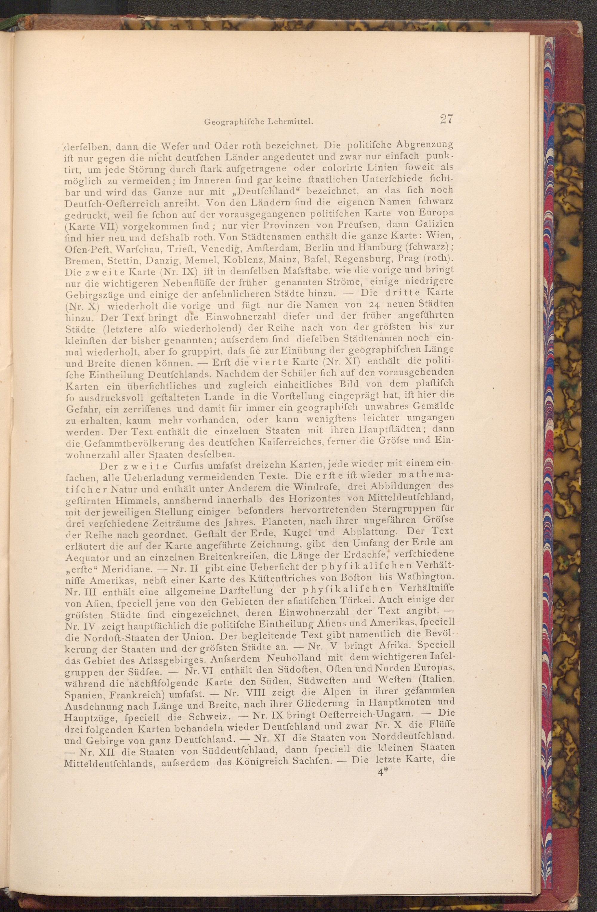 derfelben, dann die Wefer und Oder roth bezeichnet. Die politifche Abgrenzung ift nur gegen die nicht deutfchen Länder angedeutet und zwar nur einfach punk. tirt, um jede Störung durch ftark aufgetragene oder colorirte Linien foweit als möglich zu vermeiden; im Inneren find gar keine ftaatlichen Unterfchiede fichtbar und wird das Ganze nur mit Deutfchland" bezeichnet, an das fich noch Deutfch- Oefterreich anreiht. Von den Ländern find die eigenen Namen fchwarz gedruckt, weil fie fchon auf der vorausgegangenen politifchen Karte von Europa ( Karte VII) vorgekommen find; nur vier Provinzen von Preufsen, dann Galizien find hier neu und defshalb roth. Von Städtenamen enthält die ganze Karte: Wien, Ofen- Peft, Warfchau, Trieft, Venedig, Amfterdam, Berlin und Hamburg( fchwarz); Bremen, Stettin, Danzig, Memel, Koblenz, Mainz, Bafel, Regensburg, Prag( roth). Die zweite Karte( Nr. IX) ift in demfelben Mafsftabe, wie die vorige und bringt nur die wichtigeren Nebenflüffe der früher genannten Ströme, einige niedrigere. Gebirgszüge und einige der anfehnlicheren Städte hinzu. Die dritte Karte ( Nr. X) wiederholt die vorige und fügt nur die Namen von 24 neuen Städten hinzu. Der Text bringt die Einwohnerzahl diefer und der früher angeführten Städte( letztere alfo wiederholend) der Reihe nach von der gröfsten bis zur kleinften der bisher genannten; aufserdem find diefelben Städtenamen noch einmal wiederholt, aber fo gruppirt, dafs fie zur Einübung der geographifchen Länge und Breite dienen können.-Erft die vierte Karte( Nr. XI) enthält die politifche Eintheilung Deutfchlands. Nachdem der Schüler fich auf den vorausgehenden Karten ein überfichtliches und zugleich einheitliches Bild von dem plaftifch fo ausdrucksvoll geftalteten Lande in die Vorftellung eingeprägt hat, ift hier die Gefahr, ein zerriffenes und damit für immer ein geographifch unwahres Gemälde zu erhalten, kaum mehr vorhanden, oder kann wenigftens leichter umgangen werden. Der Text enthält die einzelnen Staaten mit ihren Hauptftädten; dann die Gefammtbevölkerung des deutfchen Kaiferreiches, ferner die Gröfse und Einwohnerzahl aller Staaten desfelben.