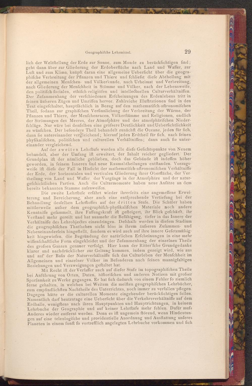 Mit Recht ift der Verfaffer auch auf diefer Stufe im topographifchen Theile bei Anführung von Orten, Daten, hiftorifchen und anderen Notizen mit grofser Sparfamkeit zu Werke gegangen. Er hat fich dadurch von einem Fehler fo ziemlich ferne gehalten, in welchen bei Weitem die meiften geographifchen Lehrbücher, zum empfindlichften Nachtheile des Unterrichtes, noch immer zu verfallen pflegen. Dagegen hätte er die culturellen Momente eingehender berücksichtigen follen. Namentlich darf heutzutage eine Ueberficht über die Verkehrsverhältniffe auf dem Erdballe, wenigftens nach ihren Hauptpunkten und Hauptrichtungen, in keinem Lehrbuche der Geographie und auf keiner Lehrftufe mehr fehlen. Dafür mufs Anderes wieder entfernt werden. Denn es ift ungemein ftörend, wenn Hindeutungen auf eine teleologifche und providentielle Anordnung und Ausftattung unferes Planeten in einem fonft fo vortrefflich angelegten Lehrbuche vorkommen und fich