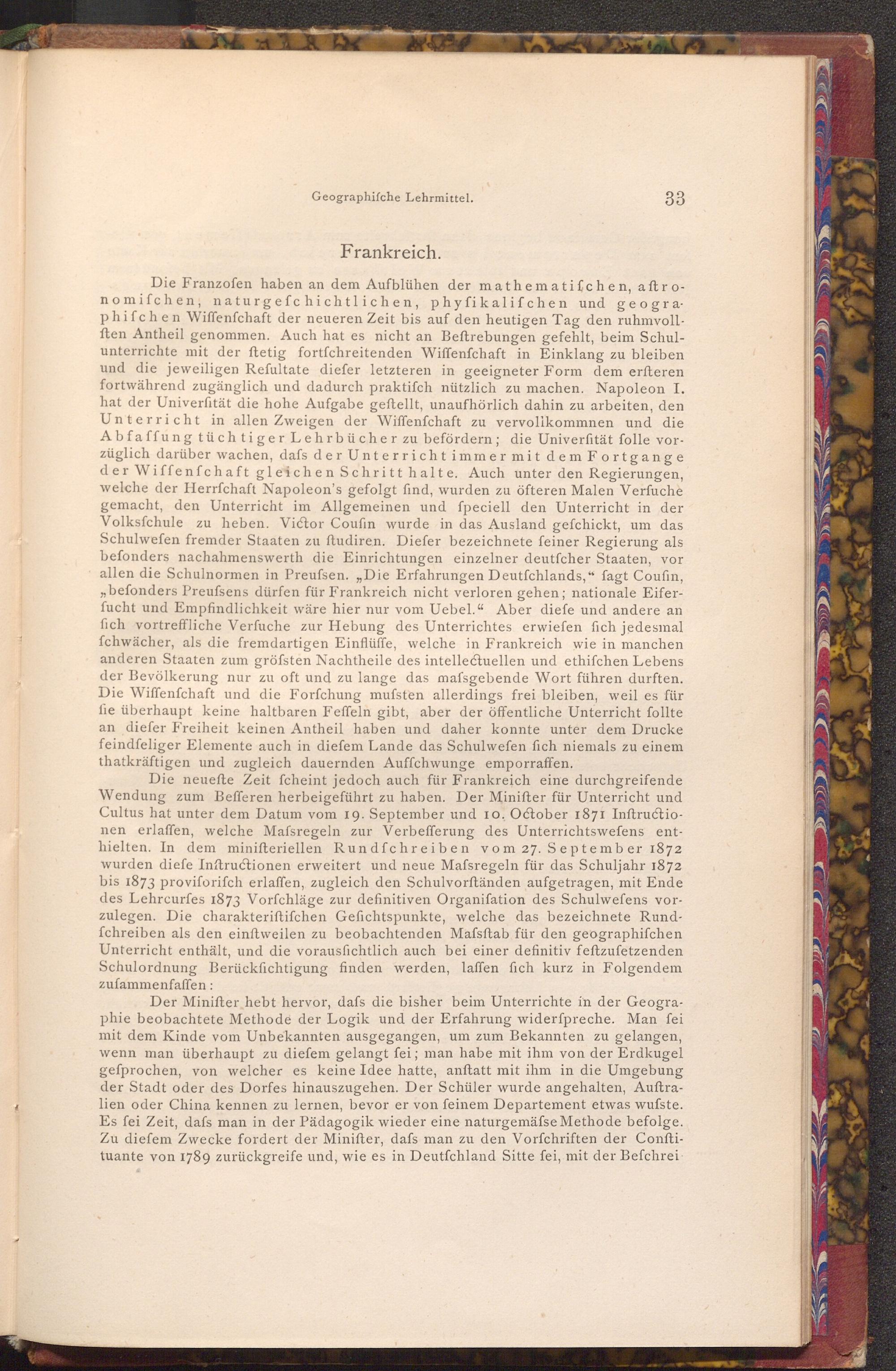 Die neuefte Zeit fcheint jedoch auch für Frankreich eine durchgreifende Wendung zum Befferen herbeigeführt zu haben. Der Minifter für Unterricht und Cultus hat unter dem Datum vom 19. September und 10. October 1871 Inftructionen erlaffen, welche Mafsregeln zur Verbefferung des Unterrichtswefens enthielten. In dem minifteriellen Rundfchreiben vom 27. September 1872 wurden diefe Instructionen erweitert und neue Mafsregeln für das Schuljahr 1872 bis 1873 proviforifch erlaffen, zugleich den Schulvorftänden aufgetragen, mit Ende des Lehrcurfes 1873 Vorfchläge zur definitiven Organiſation des Schulwefens vorzulegen. Die charakteriftifchen Gefichtspunkte, welche das bezeichnete Rundfchreiben als den einftweilen zu beobachtenden Mafsftab für den geographifchen Unterricht enthält, und die vorausfichtlich auch bei einer definitiv feftzufetzenden Schulordnung Berücksichtigung finden werden, laffen fich kurz in Folgendem