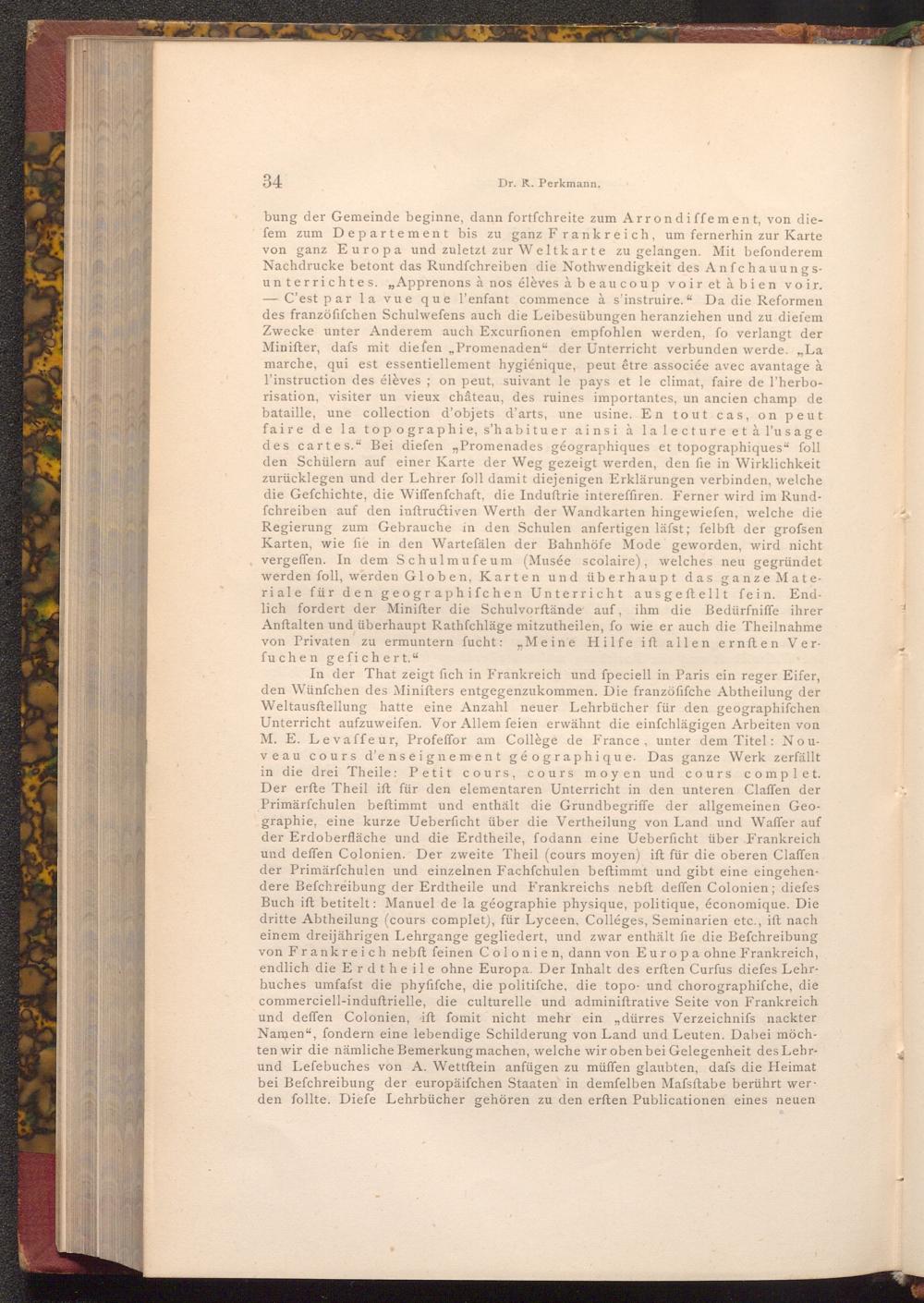In der That zeigt fich in Frankreich und fpeciell in Paris ein reger Eifer, den Wünfchen des Minifters entgegenzukommen. Die franzöfifche Abtheilung der Weltausftellung hatte eine Anzahl neuer Lehrbücher für den geographifchen Unterricht aufzuweifen. Vor Allem feien erwähnt die einfchlägigen Arbeiten von M. E. Levaffeur, Profeffor am Collège de France, unter dem Titel: Nouveau cours d'enseignement géographique. Das ganze Werk zerfällt in die drei Theile: Petit cours, cours moyen und cours complet. Der erfte Theil ift für den elementaren Unterricht in den unteren Claffen der Primärfchulen beftimmt und enthält die Grundbegriffe der allgemeinen Geographie, eine kurze Ueberficht über die Vertheilung von Land und Waffer auf der Erdoberfläche und die Erdtheile, fodann eine Ueberficht über Frankreich und deffen Colonien. Der zweite Theil( cours moyen) ift für die oberen Claffen der Primärfchulen und einzelnen Fachfchulen beftimmt und gibt eine eingehendere Befchreibung der Erdtheile und Frankreichs nebft deffen Colonien; diefes Buch ift betitelt: Manuel de la géographie physique, politique, économique. Die dritte Abtheilung( cours complet), für Lyceen, Colléges, Seminarien etc., ift nach einem dreijährigen Lehrgange gegliedert, und zwar enthält fie die Befchreibung von Frankreich nebft feinen Colonien, dann von Europa ohne Frankreich, endlich die Erdtheile ohne Europa. Der Inhalt des erften Curfus diefes Lehrbuches umfafst die phyfifche, die politifche, die topo- und chorographifche, die commerciell- induftrielle, die culturelle und adminiftrative Seite von Frankreich und deffen Colonien, ift fomit nicht mehr ein dürres Verzeichnifs nackter Namen", fondern eine lebendige Schilderung von Land und Leuten. Dabei möchten wir die nämliche Bemerkung machen, welche wir oben bei Gelegenheit des Lehrund Lefebuches von A. Wettftein anfügen zu müffen glaubten, dafs die Heimat bei Befchreibung der europäiſchen Staaten in demfelben Mafsftabe berührt wer den follte. Diefe Lehrbücher gehören zu den erften Publicationen eines neuen