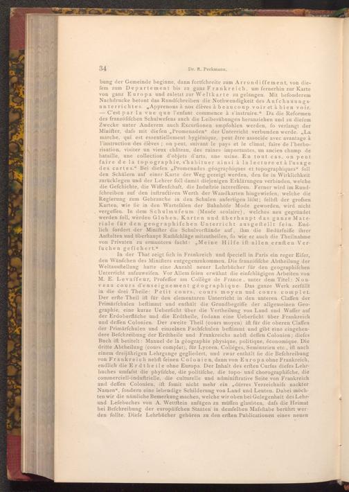 bung der Gemeinde beginne, dann fortfchreite zum Arrondiffement, von diefem zum Departement bis zu ganz Frankreich, um fernerhin zur Karte von ganz Europa und zuletzt zur Weltkarte zu gelangen. Mit befonderem Nachdrucke betont das Rundfchreiben die Nothwendigkeit des Anfchauungsunterrichtes. Apprenons à nos élèves à beaucoup voir et à bien voir. - C'est par la vue que l'enfant commence à s'instruire." Da die Reformen des franzöfifchen Schulwefens auch die Leibesübungen heranziehen und zu diefem Zwecke unter Anderem auch Excurfionen empfohlen werden, fo verlangt der Minifter, dafs mit diefen ,, Promenaden" der Unterricht verbunden werde. ,, La marche, qui est essentiellement hygiénique, peut être associée avec avantage à l'instruction des élèves; on peut, suivant le pays et le climat, faire de l'herborisation, visiter un vieux château, des ruines importantes, un ancien champ de bataille, une collection d'objets d'arts, une usine. En tout cas, on peut faire de la topographie, s'habituer ainsi à la lecture et à l'usage des cartes." Bei diefen„ Promenades géographiques et topographiques" foll den Schülern auf einer Karte der Weg gezeigt werden, den fie in Wirklichkeit zurücklegen und der Lehrer foll damit diejenigen Erklärungen verbinden, welche die Gefchichte, die Wiffenfchaft, die Induſtrie intereffiren. Ferner wird im Rundfchreiben auf den inftructiven Werth der Wandkarten hingewiefen, welche die Regierung zum Gebrauche in den Schulen anfertigen läfst; felbft der grofsen Karten, wie fie in den Wartefälen der Bahnhöfe Mode geworden, wird nicht vergeffen. In dem Schulmufeum( Musée scolaire), welches neu gegründet werden foll, werden Globen, Karten und überhaupt das ganze Materiale für den geographifchen Unterricht ausgeftellt fein. Endlich fordert der Minifter die Schulvorftände auf, ihm die Bedürfniffe ihrer Anftalten und überhaupt Rathfchläge mitzutheilen, fo wie er auch die Theilnahme von Privaten zu ermuntern fucht:" Meine Hilfe ift allen ernften Verfuchen gefichert."