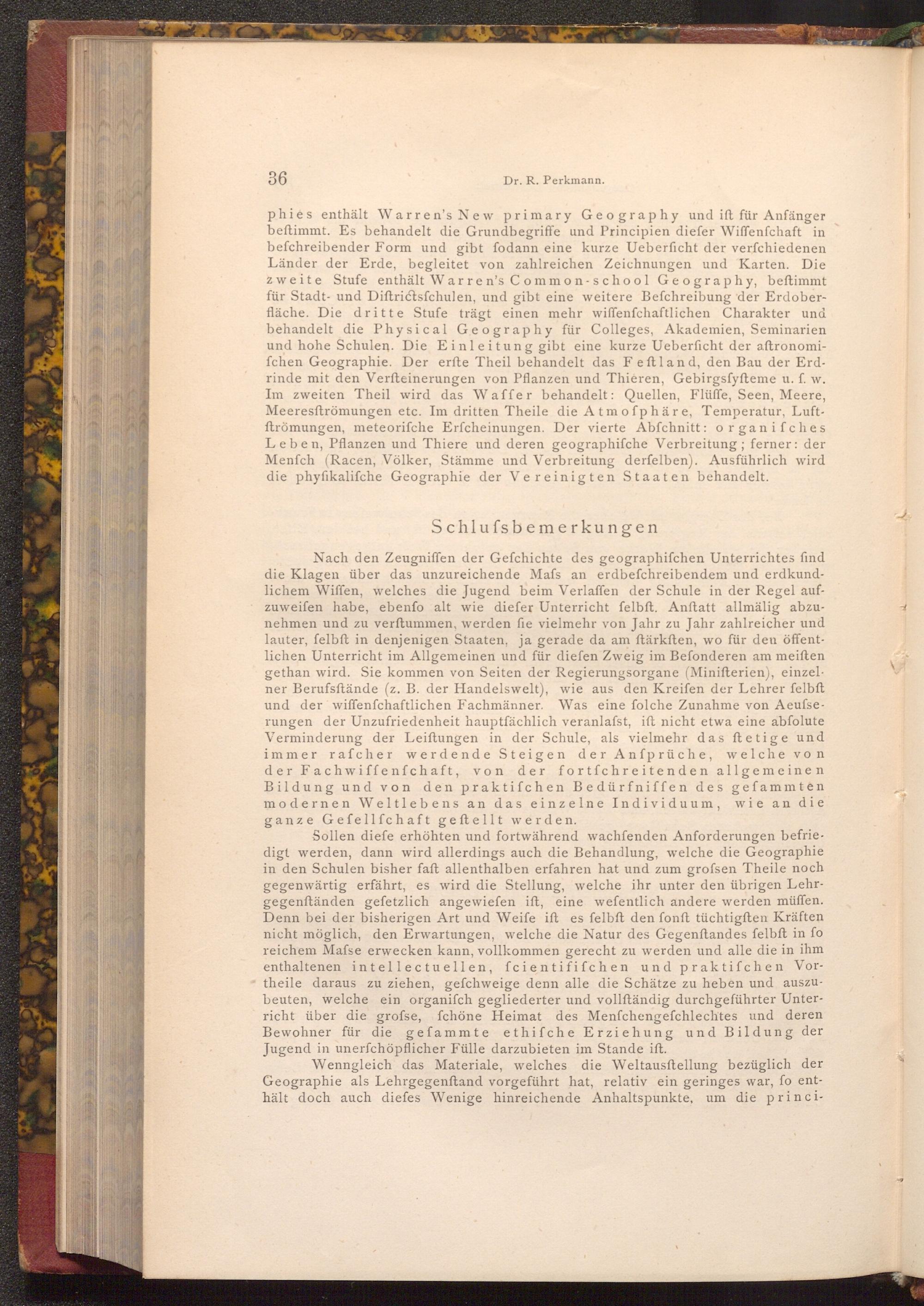 phies enthält Warren's New primary Geography und ift für Anfänger beftimmt. Es behandelt die Grundbegriffe und Principien diefer Wiffenfchaft in befchreibender Form und gibt fodann eine kurze Ueberficht der verfchiedenen Länder der Erde, begleitet von zahlreichen Zeichnungen und Karten. Die zweite Stufe enthält Warren's Common- school Geography, beſtimmt für Stadt- und Diſtrictsfchulen, und gibt eine weitere Befchreibung der Erdoberfläche. Die dritte Stufe trägt einen mehr wiffenfchaftlichen Charakter und behandelt die Physical Geography für Colleges, Akademien, Seminarien und hohe Schulen. Die Einleitung gibt eine kurze Ueberficht der aftronomifchen Geographie. Der erfte Theil behandelt das Feftland, den Bau der Erdrinde mit den Verfteinerungen von Pflanzen und Thieren, Gebirgsfyfteme u. f. w. Im zweiten Theil wird das Waffer behandelt: Quellen, Flüffe, Seen, Meere, Meeresftrömungen etc. Im dritten Theile die Atmoſphäre, Temperatur, Luftftrömungen, meteorifche Erfcheinungen. Der vierte Abſchnitt: organifches Leben, Pflanzen und Thiere und deren geographifche Verbreitung; ferner: der Menfch( Racen, Völker, Stämme und Verbreitung derfelben). Ausführlich wird die phyſikaliſche Geographie der Vereinigten Staaten behandelt.