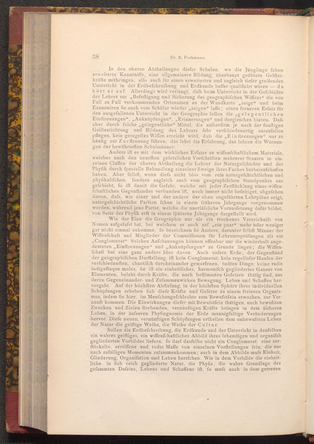 Anders ift es mit dem wirklichen Erfatze an wiffenfchaftlichem Materiale, welches nach den neueften gefetzlichen Vorfchriften mehrerer Staaten in einzelnen Claffen der oberen Abtheilung die Lehrer der Naturgefchichte und der Phyfik durch fpecielle Behandlung einzelner Zweige ihres Faches herbeizufchaffen haben. Aber felbft, wenn diefs nicht blos vom rein naturgefchichtlichen und phyfikalifchen, fondern zugleich auch vom geographifchen Standpunkte aus gefchieht, fo ift damit die Gefahr, welche mit jeder Zerftücklung eines wiffenfchaftlichen Gegenftandes verbunden ift, noch immer nicht befeitiget, abgefehen davon, dafs, wie einer und der andere der oben angeführten Lehrpläne zeigt, naturgefchichtliche Partien fchon in einem früheren Jahrgange vorgenommen werden, während jene Partie, welche die unerläfsliche Vorausfetzuug dafür bildet, von Seite der Phyfik erft in einem fpäteren Jahrgange dargestellt wird.