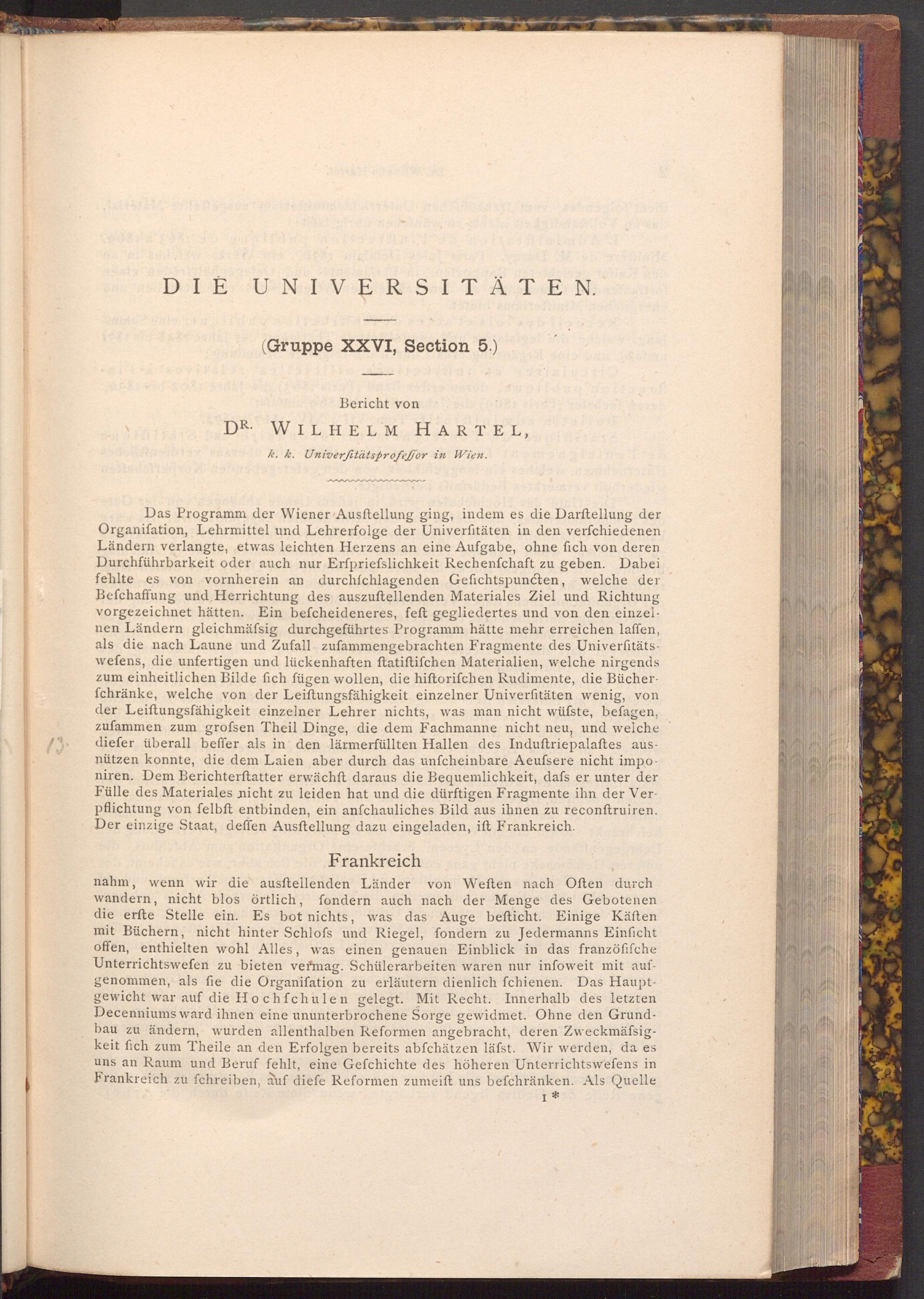 Das Programm der Wiener Ausftellung ging, indem es die Darſtellung der Organiſation, Lehrmittel und Lehrerfolge der Univerfitäten in den verfchiedenen Ländern verlangte, etwas leichten Herzens an eine Aufgabe, ohne fich von deren Durchführbarkeit oder auch nur Erfpriefslichkeit Rechenfchaft zu geben. Dabei fehlte es von vornherein an durchfchlagenden Gefichtspuncten, welche der Befchaffung und Herrichtung des auszuftellenden Materiales Ziel und Richtung vorgezeichnet hätten. Ein befcheideneres, feft gegliedertes und von den einzelnen Ländern gleichmäfsig durchgeführtes Programm hätte mehr erreichen laffen, als die nach Laune und Zufall zufammengebrachten Fragmente des Universitätswefens, die unfertigen und lückenhaften ftatiftifchen Materialien, welche nirgends zum einheitlichen Bilde fich fügen wollen, die hiftorifchen Rudimente, die Bücherfchränke, welche von der Leiftungsfähigkeit einzelner Univerſitäten wenig, von der Leiftungsfähigkeit einzelner Lehrer nichts, was man nicht wüfste, befagen, zufammen zum grofsen Theil Dinge, die dem Fachmanne nicht neu, und welche diefer überall beffer als in den lärmerfüllten Hallen des Induſtriepalaftes ausnützen konnte, die dem Laien aber durch das unfcheinbare Aeufsere nicht imponiren. Dem Berichterstatter erwächft daraus die Bequemlichkeit, dafs er unter der Fülle des Materiales nicht zu leiden hat und die dürftigen Fragmente ihn der Verpflichtung von felbft entbinden, ein anfchauliches Bild aus ihnen zu reconſtruiren. Der einzige Staat, deffen Ausftellung dazu eingeladen, ift Frankreich.
