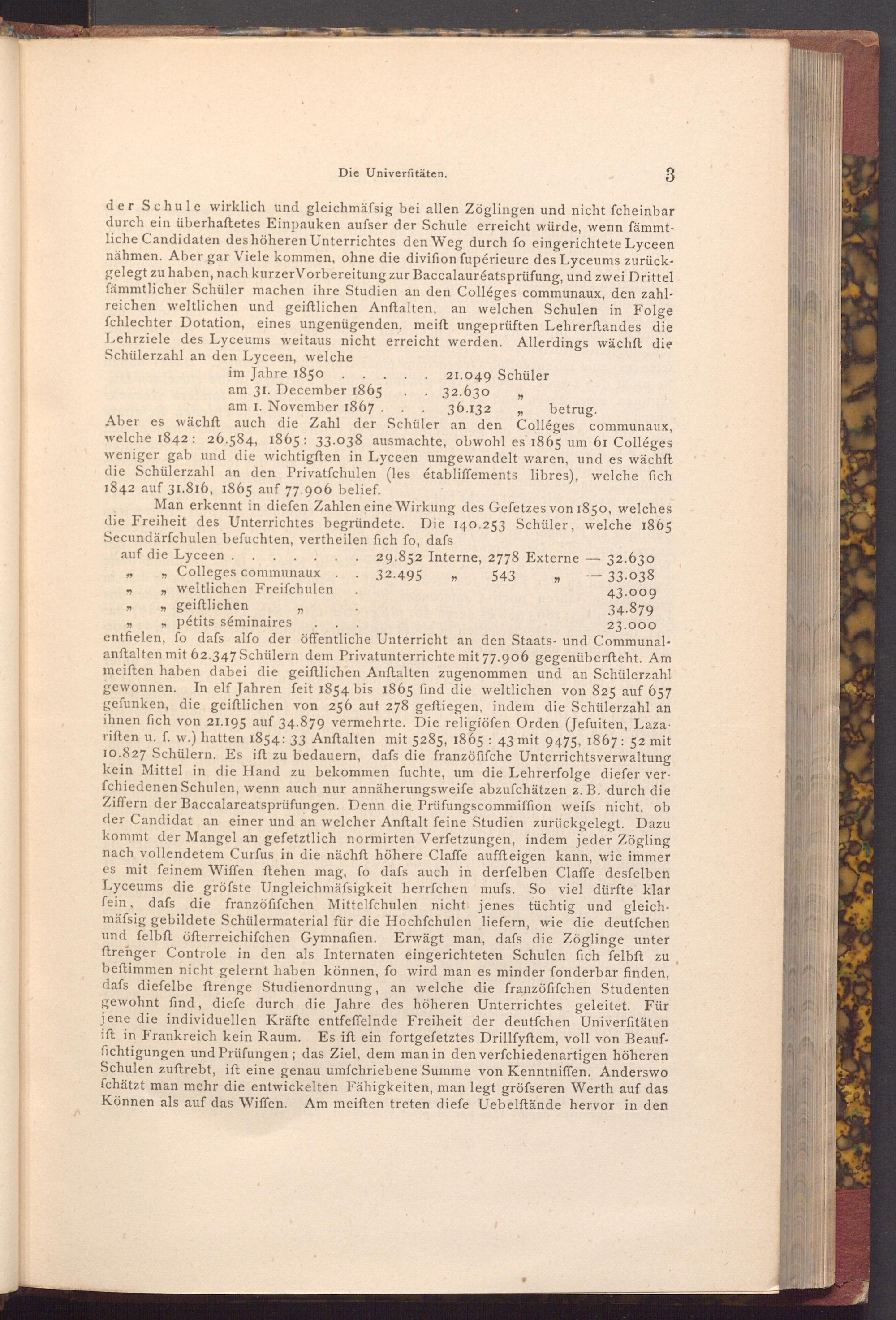 Aber es wächft auch die Zahl der Schüler an den Colléges communaux, welche 1842: 26.584, 1865: 33.038 ausmachte, obwohl es 1865 um 61 Colléges weniger gab und die wichtigften in Lyceen umgewandelt waren, und es wächft die Schülerzahl an den Privatfchulen( les établiffements libres), welche fich 1842 auf 31.816, 1865 auf 77.906 belief.