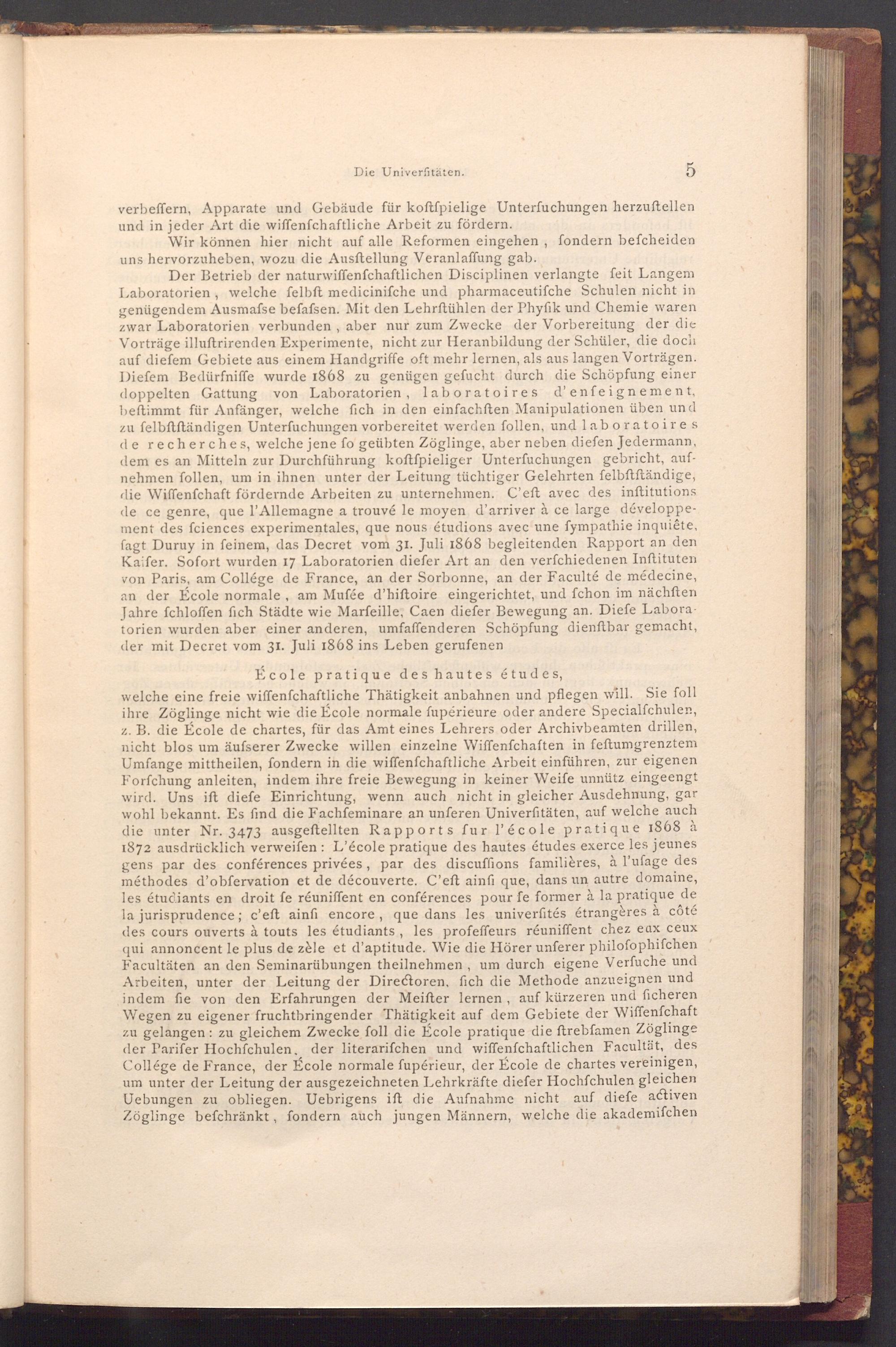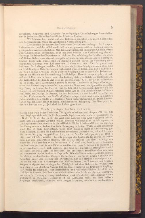 Der Betrieb der naturwiffenfchaftlichen Disciplinen verlangte feit Langem Laboratorien, welche felbft medicinifche und pharmaceutifche Schulen nicht in genügendem Ausmafse befafsen. Mit den Lehrftühlen der Phyfik und Chemie waren zwar Laboratorien verbunden, aber nur zum Zwecke der Vorbereitung der die Vorträge illuftrirenden Experimente, nicht zur Heranbildung der Schüler, die doch auf diefem Gebiete aus einem Handgriffe oft mehr lernen, als aus langen Vorträgen. Diefem Bedürfniffe wurde 1868 zu genügen gefucht durch die Schöpfung einer doppelten Gattung von Laboratorien, laboratoires d'enfeignement, beftimmt für Anfänger, welche fich in den einfachften Manipulationen üben und zu felbftftändigen Unterfuchungen vorbereitet werden follen, und laboratoires de recherches, welche jene fo geübten Zöglinge, aber neben diefen Jedermann, dem es an Mitteln zur Durchführung koftfpieliger Unterfuchungen gebricht, aufnehmen follen, um in ihnen unter der Leitung tüchtiger Gelehrten felbftftändige, die Wiffenfchaft fördernde Arbeiten zu unternehmen. C'eft avec des inftitutions de ce genre, que l'Allemagne a trouvé le moyen d'arriver à ce large développement des fciences experimentales, que nous étudions avec une fympathie inquiête, fagt Duruy in feinem, das Decret vom 31. Juli 1868 begleitenden Rapport an den Kaifer. Sofort wurden 17 Laboratorien diefer Art an den verfchiedenen Inftituten von Paris, am Collége de France, an der Sorbonne, an der Faculté de médecine, an der École normale, am Mufée d'hiftoire eingerichtet, und fchon im nächften Jahre fchloffen fich Städte wie Marfeille, Caen diefer Bewegung an. Diefe Laboratorien wurden aber einer anderen, umfaffenderen Schöpfung dienftbar gemacht, der mit Decret vom 31. Juli 1868 ins Leben gerufenen