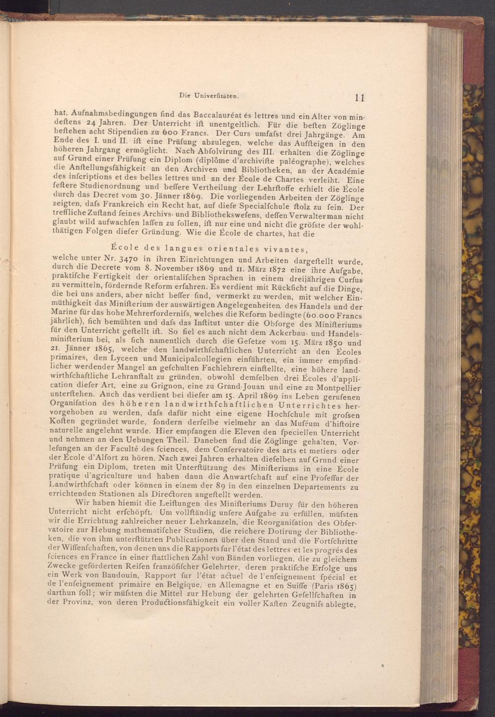 hat. Aufnahmsbedingungen find das Baccalauréat és lettres und ein Alter von mindeftens 24 Jahren. Der Unterricht ift unentgeltlich. Für die beften Zöglinge beftehen acht Stipendien zu 600 Francs. Der Curs umfafst drei Jahrgänge. Am Ende des I. und II. ift eine Prüfung abzulegen, welche das Auffteigen in den höheren Jahrgang ermöglicht. Nach Abfolvirung des III. erhalten die Zöglinge auf Grund einer Prüfung ein Diplom( diplôme d'archivifte paléographe), welches die Anftellungsfähigkeit an den Archiven und Bibliotheken, an der Académie des infcriptions et des belles lettres und an der École de Chartes verleiht. Eine feftere Studienordnung und beffere Vertheilung der Lehrftoffe erhielt die École durch das Decret vom 30. Jänner 1869. Die vorliegenden Arbeiten der Zöglinge zeigten, dafs Frankreich ein Recht hat, auf diefe Specialfchule ftolz zu fein. Der treffliche Zuftand feines Archivs- und Bibliothekswefens, deffen Verwalter man nicht glaubt wild aufwachfen laffen zu follen, ift nur eine und nicht die gröfste der wohlthätigen Folgen diefer Gründung. Wie die École de chartes, hat die