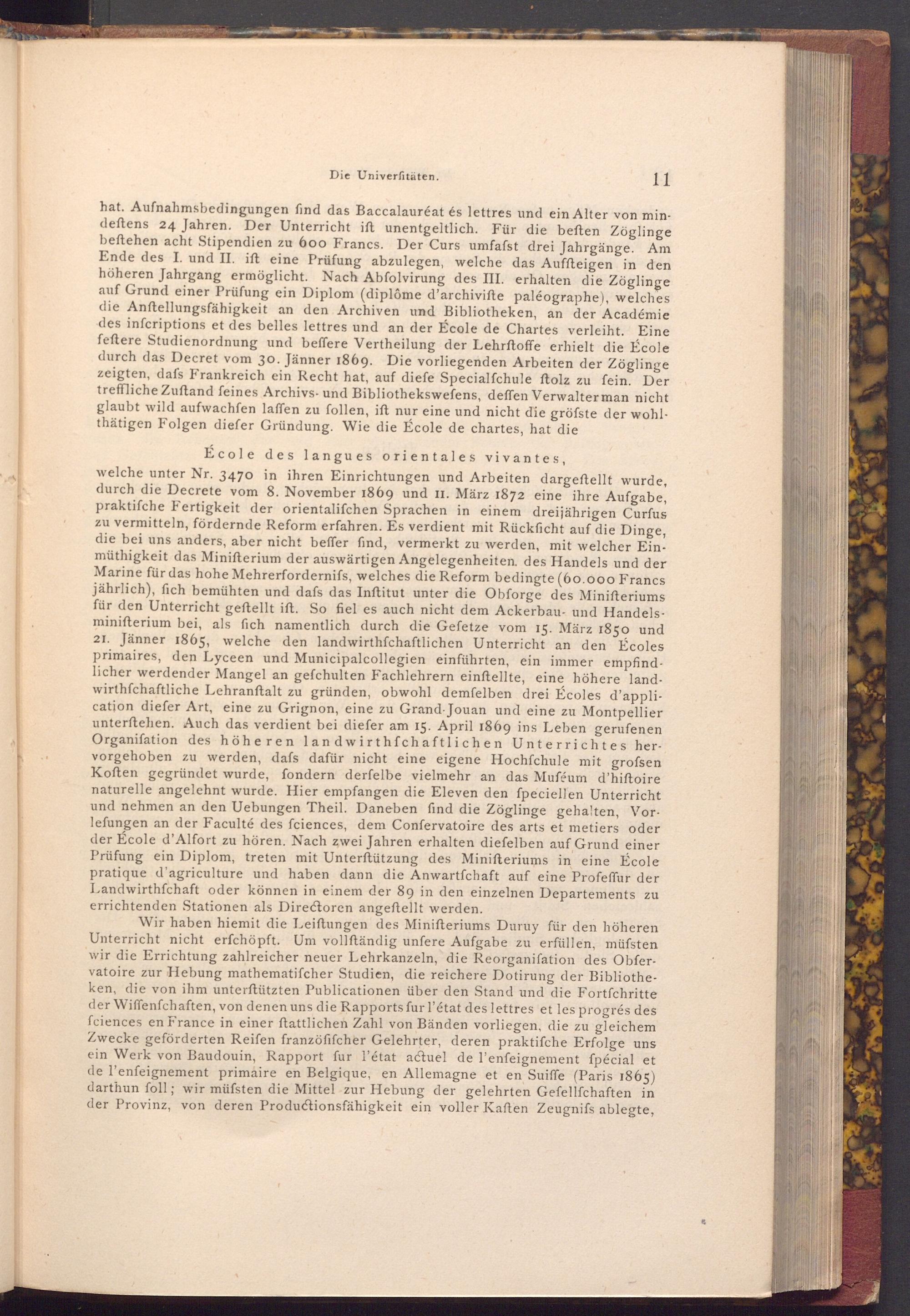 welche unter Nr. 3470 in ihren Einrichtungen und Arbeiten dargestellt wurde, durch die Decrete vom 8. November 1869 und 11. März 1872 eine ihre Aufgabe, praktiſche Fertigkeit der orientalifchen Sprachen in einem dreijährigen Curfus zu vermitteln, fördernde Reform erfahren. Es verdient mit Rückficht auf die Dinge, die bei uns anders, aber nicht beffer find, vermerkt zu werden, mit welcher Einmüthigkeit das Minifterium der auswärtigen Angelegenheiten. des Handels und der Marine für das hohe Mehrerfordernifs, welches die Reform bedingte( 60.000 Francs jährlich), fich bemühten und dafs das Inftitut unter die Obforge des Minifteriums für den Unterricht geftellt ist. So fiel es auch nicht dem Ackerbau- und Handelsminifterium bei, als fich namentlich durch die Gefetze vom 15. März 1850 und 21. Jänner 1865, welche den landwirthfchaftlichen Unterricht an den Écoles primaires, den Lyceen und Municipalcollegien einführten, ein immer empfindlicher werdender Mangel an gefchulten Fachlehrern einftellte, eine höhere landwirthschaftliche Lehranftalt zu gründen, obwohl demfelben drei Écoles d'application diefer Art, eine zu Grignon, eine zu Grand Jouan und eine zu Montpellier unterftehen. Auch das verdient bei diefer am 15. April 1869 ins Leben gerufenen Organiſation des höheren landwirthfchaftlichen Unterrichtes hervorgehoben zu werden, dafs dafür nicht eine eigene Hochſchule mit grofsen Koften gegründet wurde, fondern derfelbe vielmehr an das Muféum d'hiftoire naturelle angelehnt wurde. Hier empfangen die Eleven den fpeciellen Unterricht und nehmen an den Uebungen Theil. Daneben find die Zöglinge gehalten, Vorlefungen an der Faculté des fciences, dem Confervatoire des arts et metiers oder der École d'Alfort zu hören. Nach zwei Jahren erhalten diefelben auf Grund einer Prüfung ein Diplom, treten mit Unterſtützung des Minifteriums in eine École pratique d'agriculture und haben dann die Anwartfchaft auf eine Profeffur der Landwirthschaft oder können in einem der 89 in den einzelnen Departements zu errichtenden Stationen als Directoren angeftellt werden.