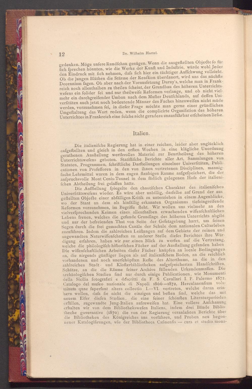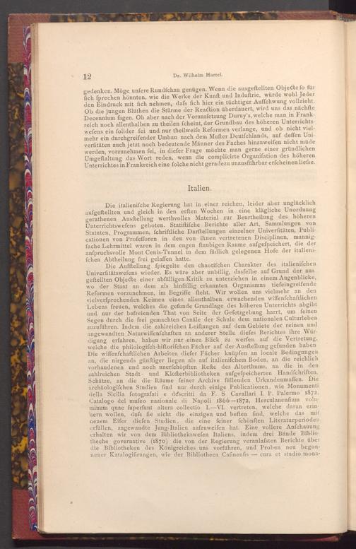 Die Aufftellung fpiegelte den chaotifchen Charakter des italienifchen Univerfitätswefens wieder. Es wäre aber unbillig, dasfelbe auf Grund der aus geftellten Objecte einer abfälligen Kritik zu unterziehen in einem Augenblicke, wo der Staat an dem als hinfällig erkannten Organismus tiefeingreifende Reformen vorzunehmen, im Begriffe fteht. Wir wollen uns vielmehr an den vielverfprechenden Keimen eines allenthalben erwachenden wiffenfchaftlichen Lebens freuen, welches die gefunde Grundlage des höheren Unterrichts abgibt und nur der befreienden That von Seite der Gefetzgebung harrt, um feinen Segen durch die frei gemachten Canäle der Schule dem nationalen Culturleben zuzuführen. Indem die zahlreichen Leiſtungen auf dem Gebiete der reinen und angewandten Naturwiffenfchaften an anderer Stelle diefes Berichtes ihre Würdigung erfahren, haben wir nur einen Blick zu werfen auf die Vertretung, welche die philologifch- hiftorifchen Fächer auf der Ausftellung gefunden haben Die wiffenfchaftlichen Arbeiten diefer Fächer knüpfen an locale Bedingungen an, die nirgends günftiger liegen als auf italienifchem Boden, an die reichlich vorhandenen und noch unerfchöpften Refte des Alterthums, an die in den zahlreichen Stadt- und Klofterbibliotheken aufgefpeicherten Handfchriften, Schätze, an die die Räume feiner Archive füllenden Urkundenmaffen. Die archäologifchen Studien find nur durch einige Publicationen, wie Monumenti della Sicilia fotografati e descritti da F. S Cavallari I. P. Palermo 1872, Catalogo del mufeo nazionale di Napoli 1866-1872, Herculanenfium voluminum quae fuperfunt altera collectio I.-VI. vertreten, welche daran erinhern wollen, dafs fie nicht die einzigen und beften find, welche das mit neuem Eifer diefen Studien, die eine feiner fchönften Literaturperioden erfüllen, zugewandte Jung- Italien aufzuweifen hat. Eine vollere Anfchauung erhalten wir von dem Bibliothekswefen Italiens, indem drei Bände Bibliotheche governative( 1870) die von der Regierung veranlafsten Berichte über die Bibliotheken des Königreiches uns vorführen, und Proben neu begonnener Katalogifirungen, wie der Bibliotheca Cafinenfis cura et studio mona