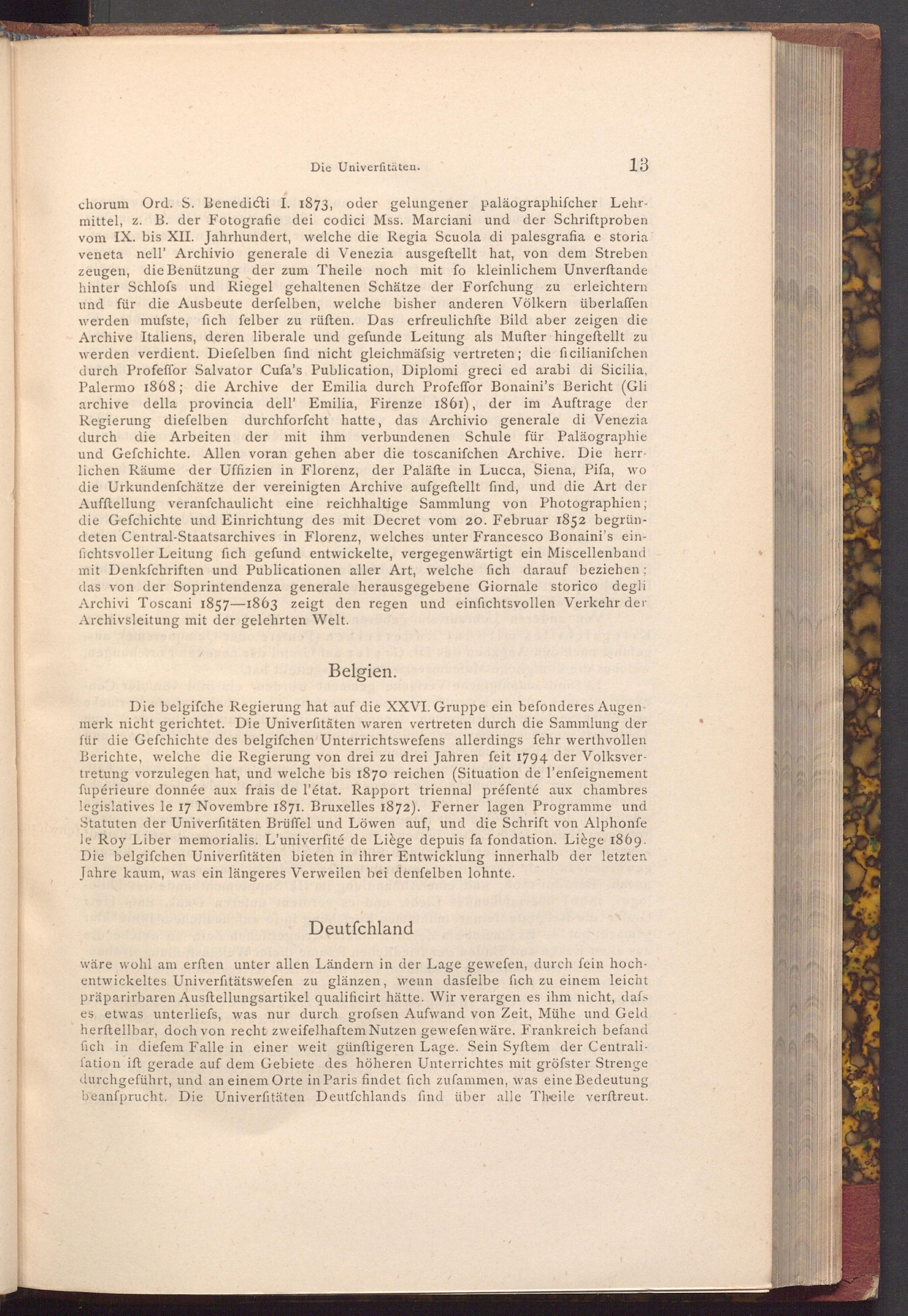 Die belgifche Regierung hat auf die XXVI. Gruppe ein befonderes Augenmerk nicht gerichtet. Die Univerſitäten waren vertreten durch die Sammlung der für die Gefchichte des belgifchen Unterrichtswefens allerdings fehr werthvollen Berichte, welche die Regierung von drei zu drei Jahren feit 1794 der Volksvertretung vorzulegen hat, und welche bis 1870 reichen( Situation de l'enfeignement fupérieure donnée aux frais de l'état. Rapport triennal préfenté aux chambres legislatives le 17 Novembre 1871. Bruxelles 1872). Ferner lagen Programme und Statuten der Univerfitäten Brüffel und Löwen auf, und die Schrift von Alphonfe le Roy Liber memorialis. L'univerfité de Liège depuis fa fondation. Liège 1869. Die belgifchen Univerfitäten bieten in ihrer Entwicklung innerhalb der letzten Jahre kaum, was ein längeres Verweilen bei denfelben lohnte.