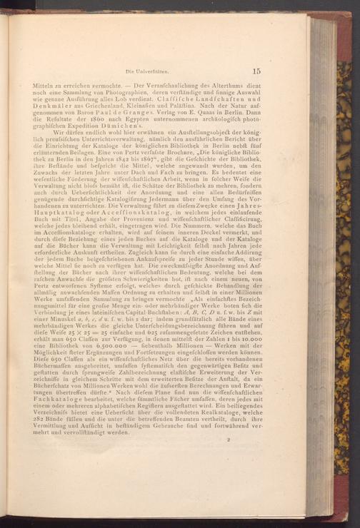 Wir dürfen endlich wohl hier erwähnen ein Ausftellungsobject der königlich preufsifchen Unterrichtsverwaltung, nämlich den ausführlichen Bericht über die Einrichtung der Kataloge der königlichen Bibliothek in Berlin nebft fünf erläuternden Beilagen. Eine von Pertz verfafste Brochure,„ Die königliche Bibliothek zu Berlin in den Jahren 1842 bis 1867", gibt die Gefchichte der Bibliothek, ihre Beftände und befpricht die Mittel, welche angewandt wurden, um den Zuwachs der letzten Jahre unter Dach und Fach zu bringen. Es bedeutet eine wefentliche Förderung der wiffenfchaftlichen Arbeit, wenn in folcher Weife die Verwaltung nicht blofs bemüht ift, die Schätze der Bibliothek zu mehren, fondern auch durch Ueberfichtlichkeit der Anordnung und eine allen Bedürfniffen genügende durchfichtige Katalogifirung Jedermann über den Umfang des Vorhandenen zu unterrichten. Die Verwaltung führt zu diefem Zwecke einen JahresHauptkatalog oder Acceffionskatalog, in welchem jedes einlaufende Buch mit Titel, Angabe der Provenienz und wiffenfchaftlicher Claffificirung, welche jedes bleibend erhält, eingetragen wird. Die Nummern, welche das Buch im Acceffionskataloge erhalten, wird auf feinem inneren Deckel vermerkt, und durch diefe Beziehung eines jeden Buches auf die Kataloge und der Kataloge auf die Bücher kann die Verwaltung mit Leichtigkeit felbft nach Jahren jede erforderliche Auskunft ertheilen. Zugleich kann fie durch eine einfache Addirung der jedem Buche beigefchriebenen Ankaufspreife zu jeder Stunde wiffen, über welche Mittel fie noch zu verfügen hat. Die zweckmäfsigfte Anordnung und Aufftellung der Bücher nach ihrer wiffenfchaftlichen Bedeutung, welche bei dem rafchen Anwachfe die gröfsten Schwierigkeiten bot, ift nach einem neuen, von Pertz entworfenen Syfteme erfolgt, welches durch gefchickte Behandlung der allmälig anwachfenden Maffen Ordnung zu erhalten und felbft in einer Millionen Werke umfaffenden Sammlung zu bringen vermochte„ Als einfachftes Bezeich nungsmittel für eine grofse Menge ein- oder mehrbändiger Werke boten fich die Verbindung je eines lateinifchen Capital- Buchftaben: A, B, C, D u. f. w. bis Z mit einer Minuskel a, b, c, d u. f. w. bis z dar; indem grundfätzlich alle Bände eines mehrbändigen Werkes die gleiche Unterfcheidungsbezeichnung führen und auf diefe Weife 25 X 25= 25 einfache und 625 zufammengefetzte Zeichen entſtehen, erhält man 650 Claffen zur Verfügung, in denen mittelft der Zahlen I bis 10.000 eine Bibliothek von 6,500.000 fiebenthalb Millionen Werken mit der Möglichkeit fteter Ergänzungen und Fortfetzungen eingefchloffen werden können. Diefe 650 Claffen als ein wiffenfchaftliches Netz über die bereits vorhandenen Büchermaffen ausgebreitet, umfaffen fyftematiſch den gegenwärtigen Befitz und geftatten durch fprungweife Zahlbezeichnung elaftifche Erweiterung der Verzeichniffe in gleichem Schritte mit dem erweiterten Befitze der Anftalt, da ein Bücherfchatz von Millionen Werken wohl die äufserften Berechnungen und Erwartungen übertreffen dürfte." Nach diefem Plane find nun die wiffenfchaftlichen Fachkataloge bearbeitet, welche fämmtliche Fächer umfaffen, deren jedes mit einem oder mehreren alphabetifchen Regiftern ausgeftattet wird. Ein beiliegendes Verzeichnifs bietet eine Ueberficht über die vollendeten Realkataloge, welche 282 Bände füllen und die unter die betreffenden Beamten vertheilt, durch ihre Vermittlung und Aufficht in beftändigem Gebrauche find und fortwährend vermehrt und vervollſtändigt werden.