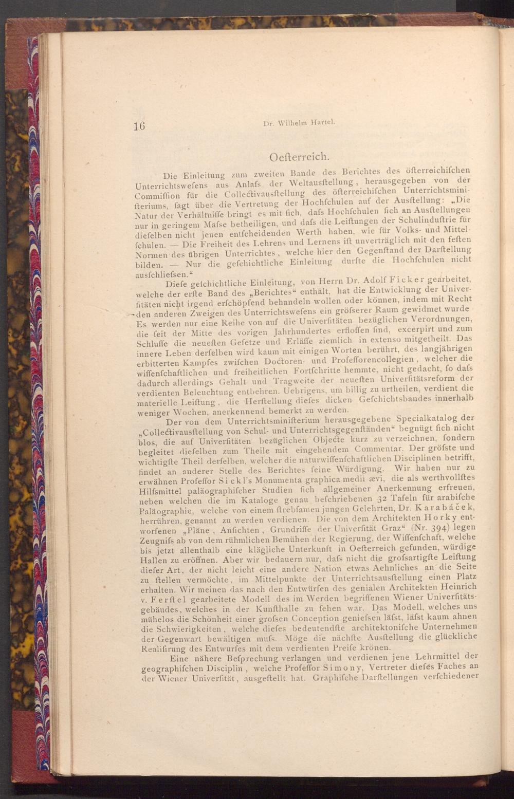 Die Einleitung zum zweiten Bande des Berichtes des öfterreichifchen Unterrichtswefens aus Anlafs der Weltausftellung, herausgegeben von der Commiffion für die Collectivausftellung des öfterreichifchen Unterrichtsminifteriums, fagt über die Vertretung der Hochfchulen auf der Ausstellung:„ Die Natur der Verhältniffe bringt es mit fich, dafs Hochſchulen fich an Ausftellungen nur in geringem Mafse betheiligen, und dafs die Leiftungen der Schulinduftrie für diefelben nicht jenen entfcheidenden Werth haben, wie für Volks- und Mittelfchulen. Die Freiheit des Lehrens und Lernens ift unverträglich mit den feften Normen des übrigen Unterrichtes, welche hier den Gegenftand der Darstellung bilden. Nur die gefchichtliche Einleitung durfte die Hochfchulen nicht ausfchliefsen."