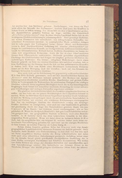 Wir glaubten den wefentlichen Inhalt des Gemäldes eingehender fkizziren zu müffen, um den Lefer mit der ganzen Reichhaltigkeit der Compofition bekannt zu machen. Wirkt das Bild fchon durch feinen Gegenftand im hohen Grade belehrend, fo wird die Wirkung noch gefteigert durch die aufserordentliche Naturwahrheit in Linien und Farben, mit welchen alle erwähnten Erfcheinungen wiedergegeben find. Nur ein vieljähriges Studium der Gletfcherwelt vermag ein derartiges Erfaffen derfelben zu ermöglichen, aber auch nur eine künftlerifch fo gefchulte und gleichzeitig durch das Auge des Naturforfchers geleitete Hand, wie jene Simony's ift im Stande, das Gefehene derart wiederzugeben, wie es hier gefchehen ift. Wenn der Ausfpruch Humbold's, dafs gute Landfchaftsbilder wefentlich geeignet find, das geographifche Studium zu fördern, noch eines Beweifes bedürfte, fo ift derfelbe durch das eben befprochene Gemälde in der überzeugendften Weife geliefert. Wenn wir dabei etwas zu bedauern haben, fo ift es diefs, dafs das ausgeftellte Bild ein Original ift, welches bisher noch keine entfprechende Vervielfältigung gefunden hat und fomit nur der einzigen Hochfchule zu Gute kommt, an welcher Simony als Lehrer thätig ift.