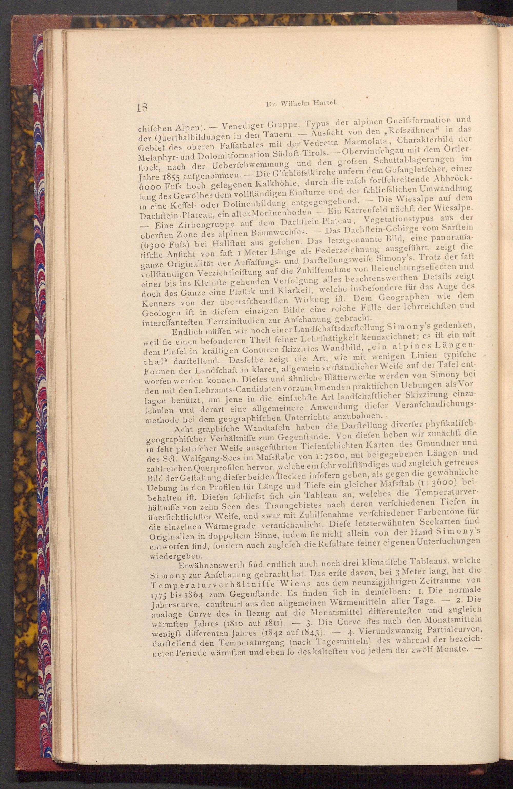 Acht graphifche Wandtafeln haben die Darftellung diverfer phyſikaliſchgeographifcher Verhältniffe zum Gegenftande. Von diefen heben wir zunächft die in fehr plaftifcher Weife ausgeführten Tiefenfchichten Karten des Gmundner und des Sct. Wolfgang- Sees im Mafsftabe von 1: 7200, mit beigegebenen Längen- und zahlreichen Querprofilen hervor, welche ein fehr vollſtändiges und zugleich getreues Bild der Geftaltung diefer beiden Becken infofern geben, als gegen die gewöhnliche Uebung in den Profilen für Länge und Tiefe ein gleicher Mafsftab( 1: 3600) beibehalten ift. Diefen fchliefst fich ein Tableau an, welches die Temperaturverhältniffe von zehn Seen des Traungebietes nach deren verfchiedenen Tiefen in überfichtlichfter Weife, und zwar mit Zuhilfenahme verfchiedener Farbentöne für die einzelnen Wärmegrade veranfchaulicht. Diefe letzterwähnten Seekarten find Originalien in doppeltem Sinne, indem fie nicht allein von der Hand Simony's entworfen find, fondern auch zugleich die Refultate feiner eigenen Unterfuchungen wiedergeben.