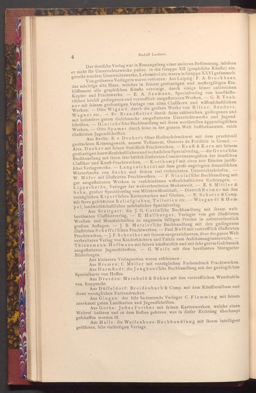 Von gröfseren Verlegern waren vertreten: Aus Leipzig: F. A. Brockhaus, das mächtige alte Haus, welches in feinem grofsartigen und muftergiltigen Etabliffement alle graphifchen Künfte vereinigt, durch einige feiner zahlreichen Kupfer- und Prachtwerke, E. A. Seemann, Specialverlag von kunfthiftorifchen höchft gediegenen und vortrefflich ausgeftatteten Werken, G. B. Teubner mit feinem grofsartigen Verlage von alten Claffikern und wiffenfchaftlichen Werken, Otto Wigand, durch die grofsen Werke von Ritter, Sanders, Fr. Brandftetter durch feine zahlreichen, gediegenen und Wagner etc., mit befonders gutem Gefchmacke ausgeftatteten Unterrichtswerke und Jugendfchriften, Hinrichs'fche Buchhandlung mit ihren werthvollen ägyptologifchen Werken, Otto Spamer durch feine in der ganzen Welt beftbekannten, reich illuftrirten Jugendfchriften.