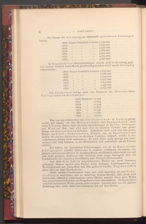 Was von den Zahlen über den Frachtenverkehr in Leipzig gefagt wurde, gilt ebenfo von den Mefseinnahmen und Baarpacketen; denn aufser Leipzig finden auch jährliche Abrechnungen in Berlin, Stuttgart und Wien etc. ftatt, und wird auch dort im internen Verkehr eine grofse Menge von Baarpacketen befördert. Ausserdem wird noch eine fehr grofse Menge von Schul-, Gebetbüchern, Bibeln, etc. an Buchbinder und andere Nichtbuchhändler in directem Verkehre verkauft, welche in den vorftehenden Zahlen nicht vorkommen. Es wird daher nicht gewagt fein, anzunehmen, dafs diefe Summen in der Wirklichkeit fich mindeftens um 50 Percent erhöhen.