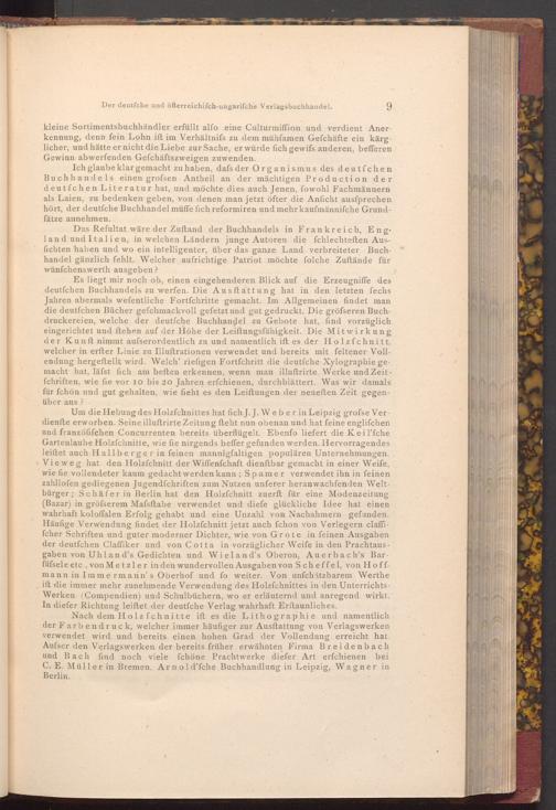 Es liegt mir noch ob, einen eingehenderen Blick auf die Erzeugniffe des deutfchen Buchhandels zu werfen. Die Ausstattung hat in den letzten fechs Jahren abermals wefentliche Fortfchritte gemacht. Im Allgemeinen findet man die deutfchen Bücher gefchmackvoll gefetzt und gut gedruckt. Die gröfseren Buchdruckereien, welche der deutſche Buchhandel zu Gebote hat, find vorzüglich eingerichtet und ftehen auf der Höhe der Leiftungsfähigkeit. Die Mitwirkung der Kunft nimmt aufserordentlich zu und namentlich ift es der Holzfchnitt, welcher in erfter Linie zu Illuftrationen verwendet und bereits mit feltener Vollendung hergeftellt wird. Welch' riefigen Fortfchritt die deutfche Xylographie gemacht hat, läfst fich am beften erkennen, wenn man illuftrirte Werke und Zeitfchriften, wie fie vor 10 bis 20 Jahren erfchienen, durchblättert. Was wir damals für fchön und gut gehalten, wie fieht es den Leiftungen der neueften Zeit gegenüber aus?