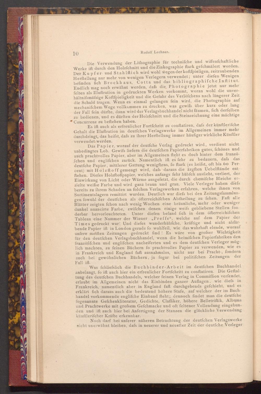 Das Papier, worauf der deutfche Verlag gedruckt wird, verdient nicht unbedingtes Lob. Gewifs liefern die deutfchen Papierfabriken gutes, fchönes und auch prachtvolles Papier, aber im Allgemeinen fteht es doch hinter dem franzöfchen und englifchen zurück. Namentlich ift es fehr zu bedauern, dafs das deutfche Papier, mittlerer Gattung wenigftens, fo ftark( es heifst, oft bis 60 Percent) mit Holzft off gemengt wird, dafs daraus die ärgften Uebelftände entftehen. Diefes Holzftoffpapier, welches anfangs fehr hübfch ausfieht, verliert, der Einwirkung von Licht oder Wärme ausgefetzt, die durch chemifche Bleiche erzielte weifse Farbe und wird ganz braun und grau. Viele Verleger haben diefs bereits zu ihrem Schaden an folchen Verlagswerken erfahren, welche ihnen von Sortimentslagern remittirt wurden. Deutlich war diefs bei den Zeitungsfammlungen fowohl der deutfchen als öfterreichifchen Abtheilung zu fehen. Faft alle Blätter zeigten fchon nach wenig Wochen eine bräunliche, mehr oder weniger dunkel nuancirte Farbe, zwifchen denen einige weifs gebliebene Stellen fon derbar hervorleuchteten. Unter diefen befand fich in dem öfterreichifchen Tableau eine Nummer der Wiener Preffe", welche auf dem Papier der Times gedruckt war! Und diefes wunderhübfche, kräftige und nicht abfärbende Papier ift in London gerade fo wohlfeil, wie das wahrhaft elende, worauf unfere meiſten Zeitungen gedruckt find! Es wäre von grofser Wichtigkeit für den deutfchen Verlagsbuchhandel, wenn die heimifchen Papierfabriken den franzöfifchen und englifchen nacheiferten und es dem deutfchen Verleger möglich machten, zu feinen Büchern fo prachtvolles Papier zu verwenden, wie es in Frankreich und England faft ausnahmslos, nicht nur bei Pracht-, fondern auch bei gewöhnlichen Büchern, ja fogar bei politifchen Zeitungen der