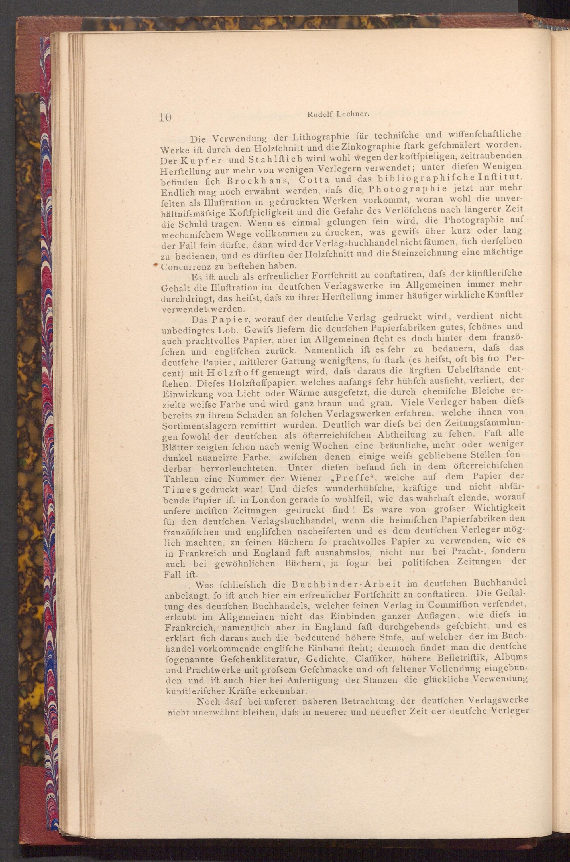 Die Verwendung der Lithographie für technifche und wiffenfchaftliche Werke ift durch den Holzſchnitt und die Zinkographie ftark gefchmälert worden. Der Kupfer und Stahlftich wird wohl wegen der koftfpieligen, zeitraubenden Herſtellung nur mehr von wenigen Verlegern verwendet; unter diefen Wenigen befinden fich Brockhaus, Cotta und das bibliographifche Inftitut. Endlich mag noch erwähnt werden, dafs die, Photographie jetzt nur mehr felten als Illuftration in gedruckten Werken vorkommt, woran wohl die unverhältnifsmäfsige Koftfpieligkeit und die Gefahr des Verlöfchens nach längerer Zeit die Schuld tragen. Wenn es einmal gelungen fein wird, die Photographie auf mechanifchem Wege vollkommen zu drucken, was gewifs über kurz oder lang der Fall fein dürfte, dann wird der Verlagsbuchhandel nicht fäumen, fich derfelben zu bedienen, und es dürften der Holzfchnitt und die Steinzeichnung eine mächtige Concurrenz zu beftehen haben.