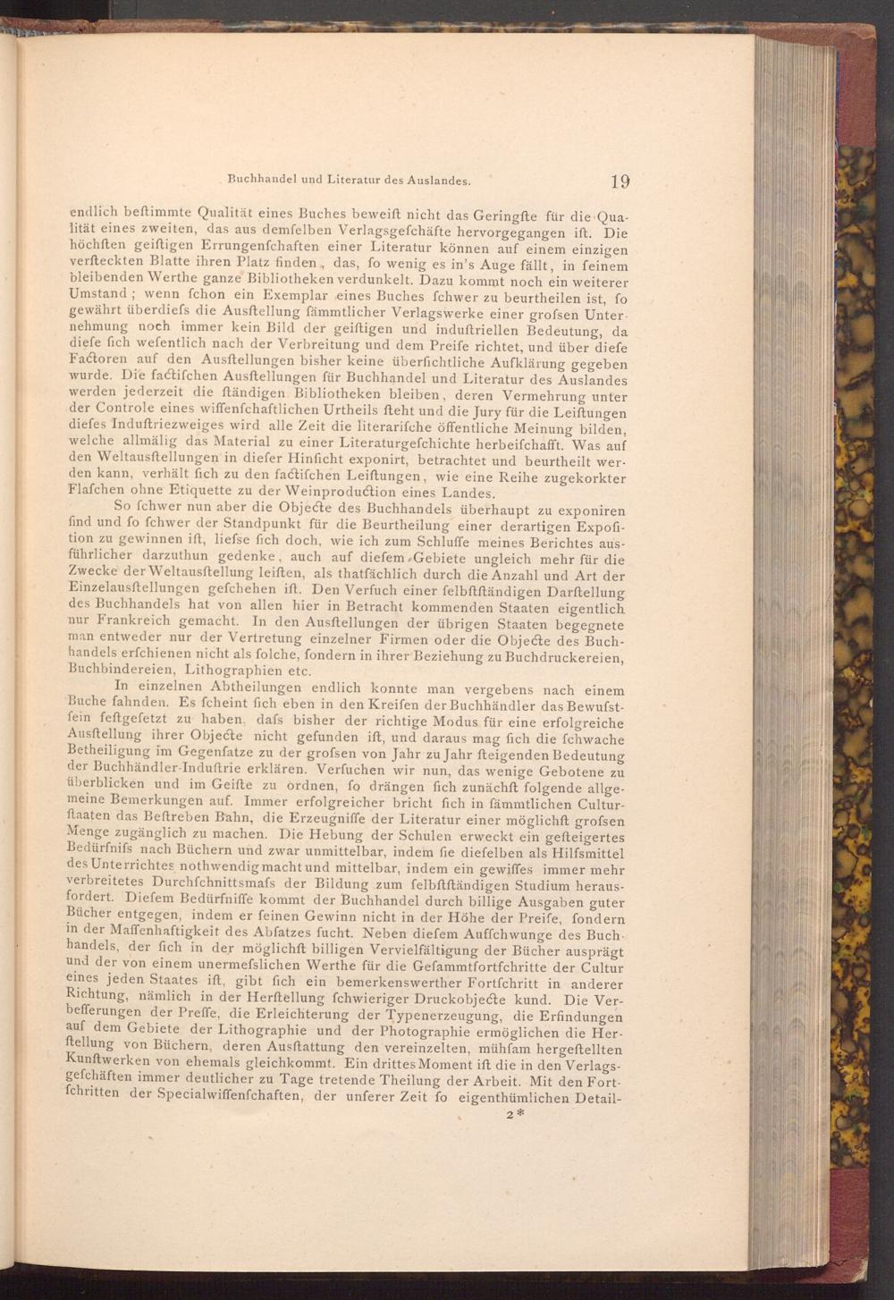So fchwer nun aber die Objecte des Buchhandels überhaupt zu exponiren find und fo fchwer der Standpunkt für die Beurtheilung einer derartigen Expofition zu gewinnen ift, liefse fich doch, wie ich zum Schluffe meines Berichtes ausführlicher darzuthun gedenke, auch auf diefem Gebiete ungleich mehr für die Zwecke der Weltausftellung leiften, als thatfächlich durch die Anzahl und Art der Einzelausstellungen gefchehen ift. Den Verfuch einer felbftftändigen Darftellung des Buchhandels hat von allen hier in Betracht kommenden Staaten eigentlich nur Frankreich gemacht. In den Ausftellungen der übrigen Staaten begegnete man entweder nur der Vertretung einzelner Firmen oder die Objecte des Buchhandels erfchienen nicht als folche, fondern in ihrer Beziehung zu Buchdruckereien, Buchbindereien, Lithographien etc.