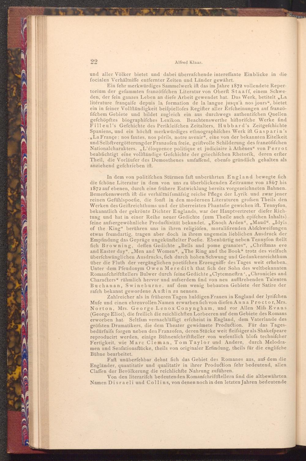 Zahlreicher als in früheren Tagen huldigen Frauen in England der lyrifchen Mufe und einen ehrenvollen Namen erwarben fich von diefen Anna Proctor, Mrs. Norton, Mrs. George Lenox Conyngham, und vor Allen Mifs Evans ( George Eliot), die freilich die reichlichften Lorbeeren auf dem Gebiete des Romans erworben hat. Seltfam vernachläffigt erfcheint in England, dem Vaterlande des gröfsten Dramatikers, die dem Theater gewidmete Production. Für das Tagesbedürfnifs forgen neben den Franzofen, deren Stücke weit fleifsiger als Shakeſpeare reproducirt werden, einige Bühnenfchriftfteller von wefentlich blofs technifcher Fertigkeit, wie Marc Cleman, Tom Taylor und Andere, durch Melodramen und Senfationsftücke, theils von originaler Erfindung, theils für die englifche Bühne bearbeitet.