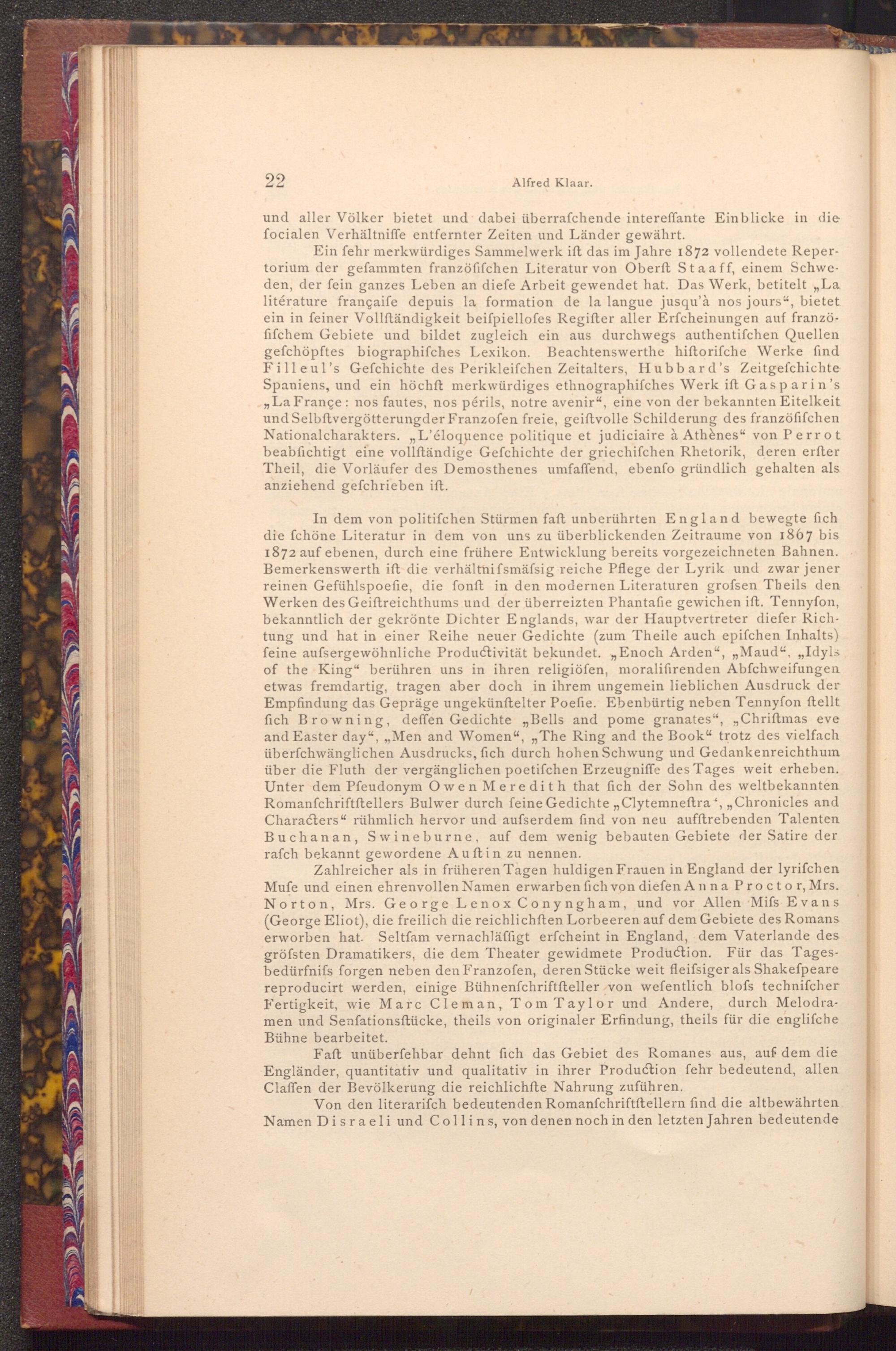 In dem von politifchen Stürmen faft unberührten England bewegte fich die fchöne Literatur in dem von uns zu überblickenden Zeitraume von 1867 bis 1872 auf ebenen, durch eine frühere Entwicklung bereits vorgezeichneten Bahnen. Bemerkenswerth ift die verhältnifsmäfsig reiche Pflege der Lyrik und zwar jener reinen Gefühlspoefie, die fonft in den modernen Literaturen grofsen Theils den Werken des Geiftreichthums und der überreizten Phantafie gewichen ift. Tennyfon, bekanntlich der gekrönte Dichter Englands, war der Hauptvertreter diefer Richtung und hat in einer Reihe neuer Gedichte( zum Theile auch epifchen Inhalts) feine aufsergewöhnliche Productivität bekundet. Enoch Arden"," Maud"," Idyls of the King" berühren uns in ihren religiöfen, moralifirenden Abfchweifungen etwas fremdartig, tragen aber doch in ihrem ungemein lieblichen Ausdruck der Empfindung das Gepräge ungekünftelter Poefie. Ebenbürtig neben Tennyson ftellt fich Browning, deffen Gedichte Bells and pome granates"," Chriſtmas eve and Easter day"," Men and Women"," The Ring and the Book" trotz des vielfach überfchwänglichen Ausdrucks, fich durch hohen Schwung und Gedankenreichthum über die Fluth der vergänglichen poetifchen Erzeugniffe des Tages weit erheben. Unter dem Pfeudonym Owen Meredith that fich der Sohn des weltbekannten Romanfchriftftellers Bulwer durch feine Gedichte ,, Clytemneftra ,,, Chronicles and Characters" rühmlich hervor und aufserdem find von neu aufftrebenden Talenten Buchanan, Swineburne, auf dem wenig bebauten Gebiete der Satire der rafch bekannt gewordene Auſtin zu nennen.