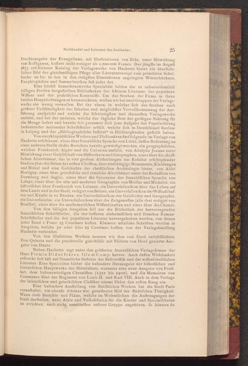 Prachtausgabe des Evangeliums, mit Illuftrationen von Bida, unter Mitwirkung von Roffigneux, koftete nicht weniger als 1,200.000 Francs. Der jüngfte im Auguft 1873 erfchienene Katalog der Verlagswerke von Hachette bietet ein überfichtliches Bild der gleichmässigen Pflege aller Literaturzweige vom primitiven Schulbuche an bis zu den in den riefigften Dimenfionen angelegten Wörterbüchern, Encyklopädien und Sammelwerken faft jeder Art.